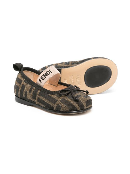 Ballerinas con monograma de la marca Fendi Kids. Color marrón, algodón, piel de becerro, paneles laterales elásticos, estampado del monograma FF en toda la pieza, puntera redonda y suela plana de goma. Fendi Kids tiene una impresión de marca reconocible, popular en todo el mundo. Las colecciones infantiles repiten modelos para adultos, combinan lujo y comodidad.