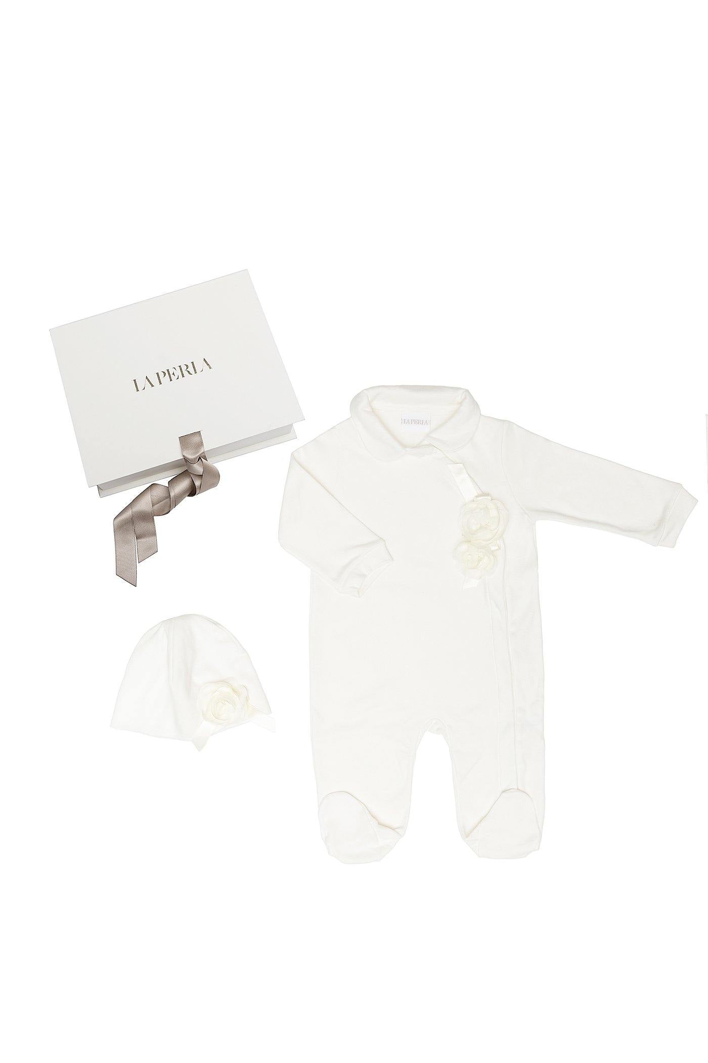 Éste body con las mangas y perneras largas en color blanco para bebé niña será la prenda más comfortable de su pequeña para invierno. Está hecho de algodón, confeccionado en un tejido de punto agradable y suave. Adorable con su diseño, se realisa con una flor en parte delantera. Éste conjunto va con un gorro que tambien tiene una flor y esta hecho de algodón.