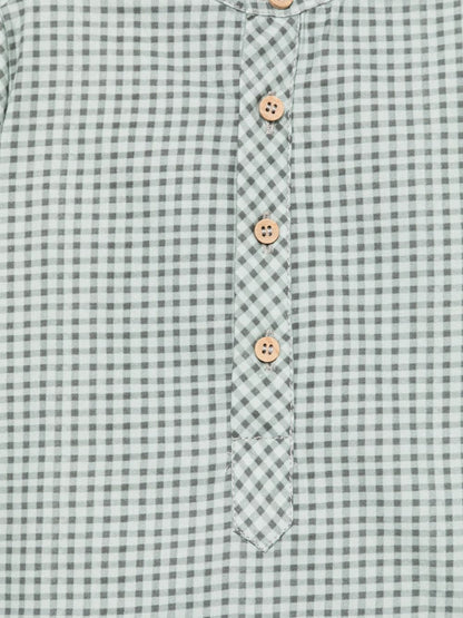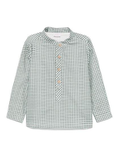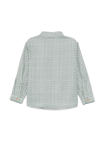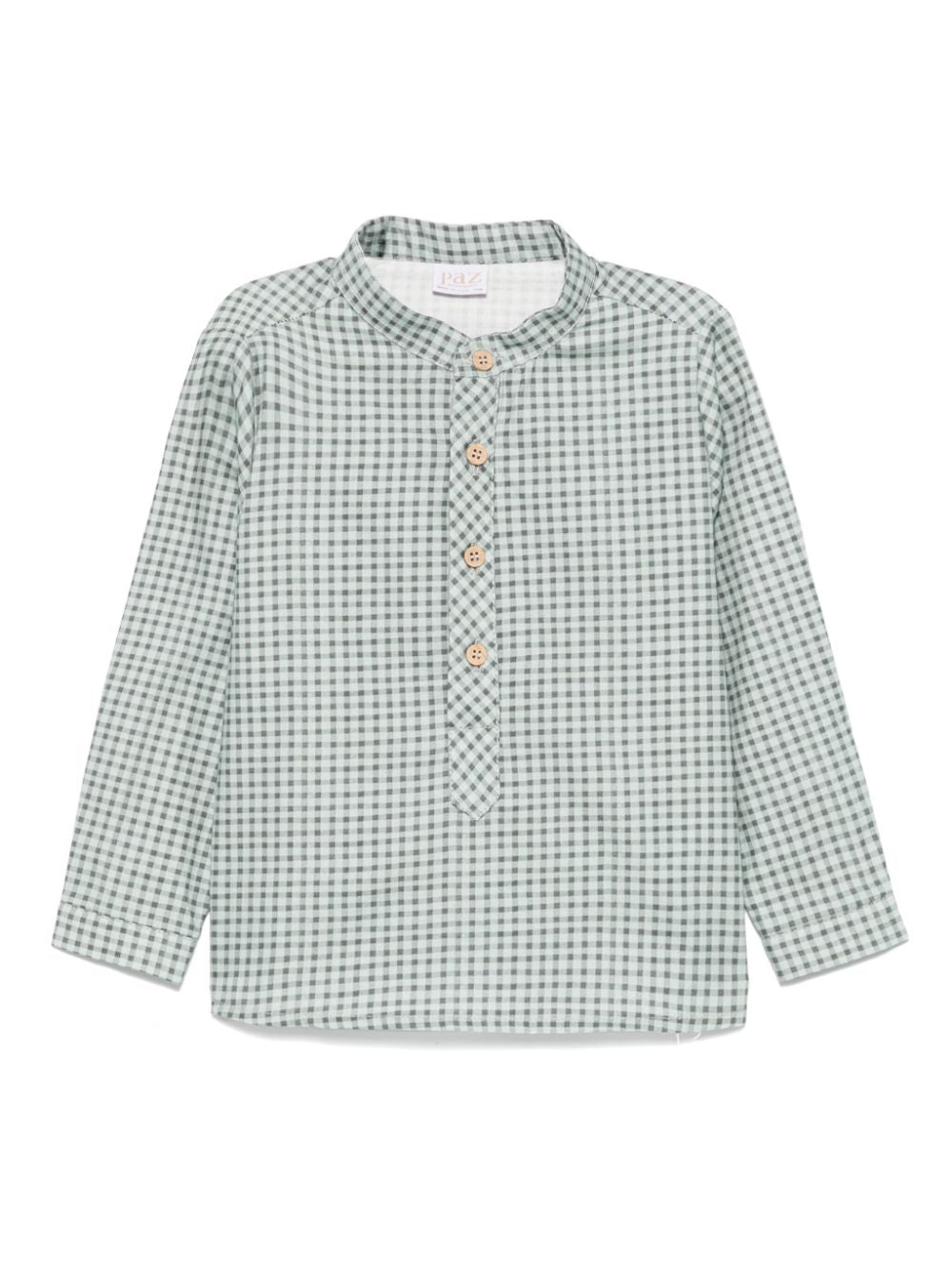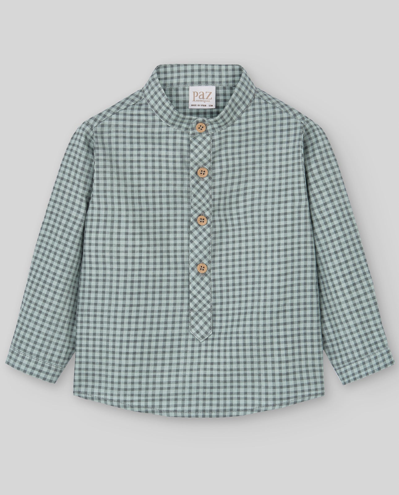 Camisa verde de la marca PAZ RODRIGUEZ. Prenda con detalles, con botones en la apertura, de algodón. Camisa para niño en manga larga, cuello alta, cómoda y sofisticada. Ideal para cualquier ocasión de Otoño-Invierno. Tela de especial calidad con un diseño elegante-formal. Camisa de la marca Paz Rodriguez fabricadas siempre con las más exigentes normas de seguridad, primando materias primas naturales como el algodón o la lana merina extra, y siempre bajo el sello “hecho en España”.