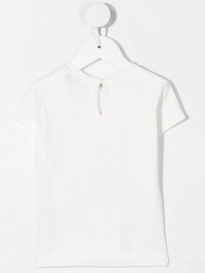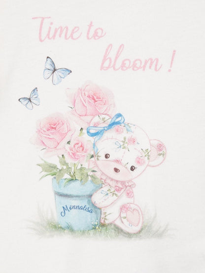 Camiseta de la marca Monnalisa. Estampado Teddy Bear, estampado floral en la parte delantera, estampado del logo en la parte delantera, estampado de eslogan en la parte delantera, cuello redondo, manga corta y detalle de abertura en la parte posterior. Material: algodón.