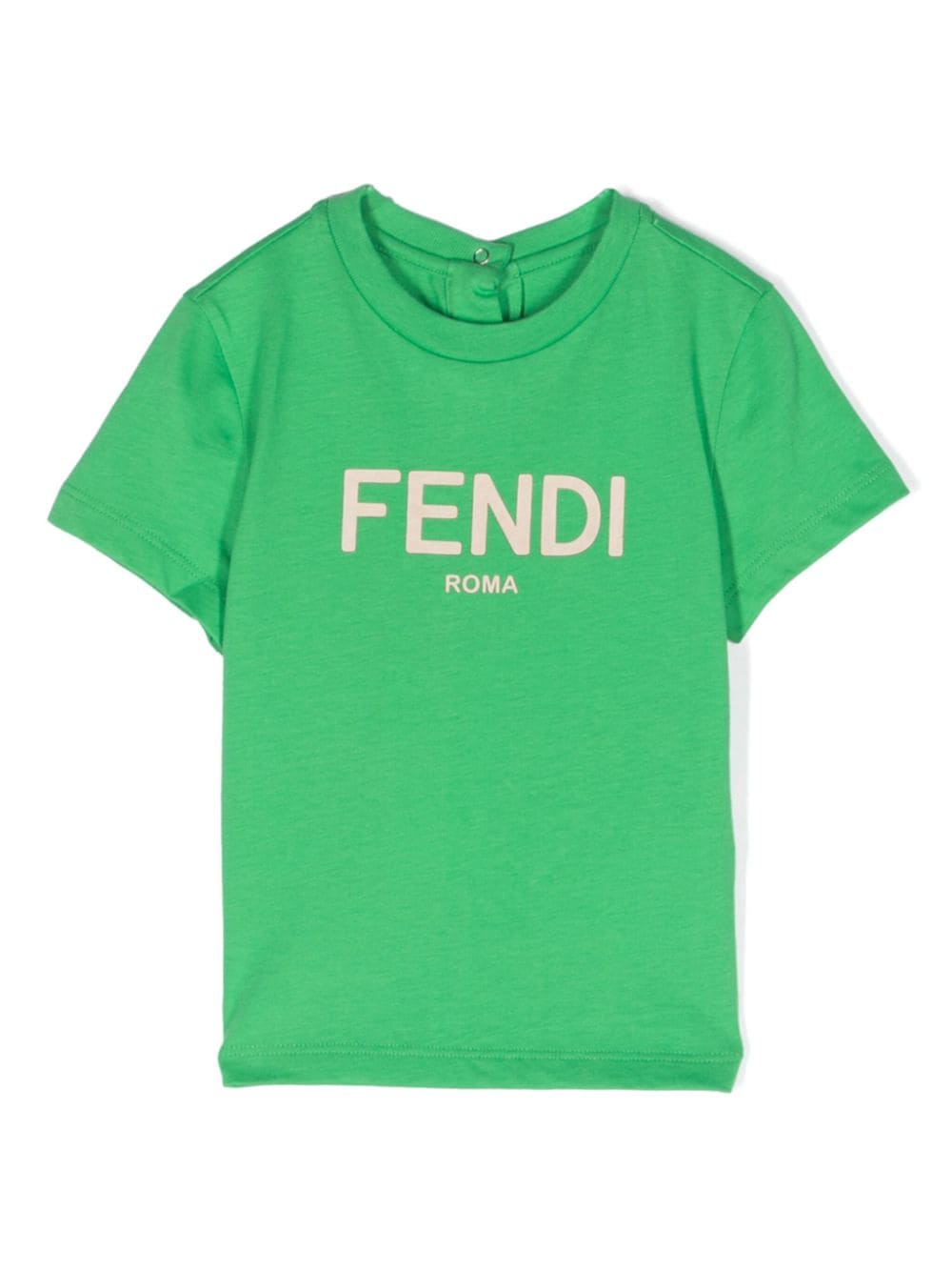 Camiseta color verde con logo estampado de la marca Fendi Kids. Verde, algodón, estampado del logo en la parte delantera, cuello redondo, cierre con botón en la parte posterior, manga corta y dobladillo recto. Fendi Kids tiene una impresión de marca reconocible, popular en todo el mundo. Las colecciones infantiles repiten modelos para adultos, combinan lujo y comodidad.