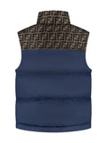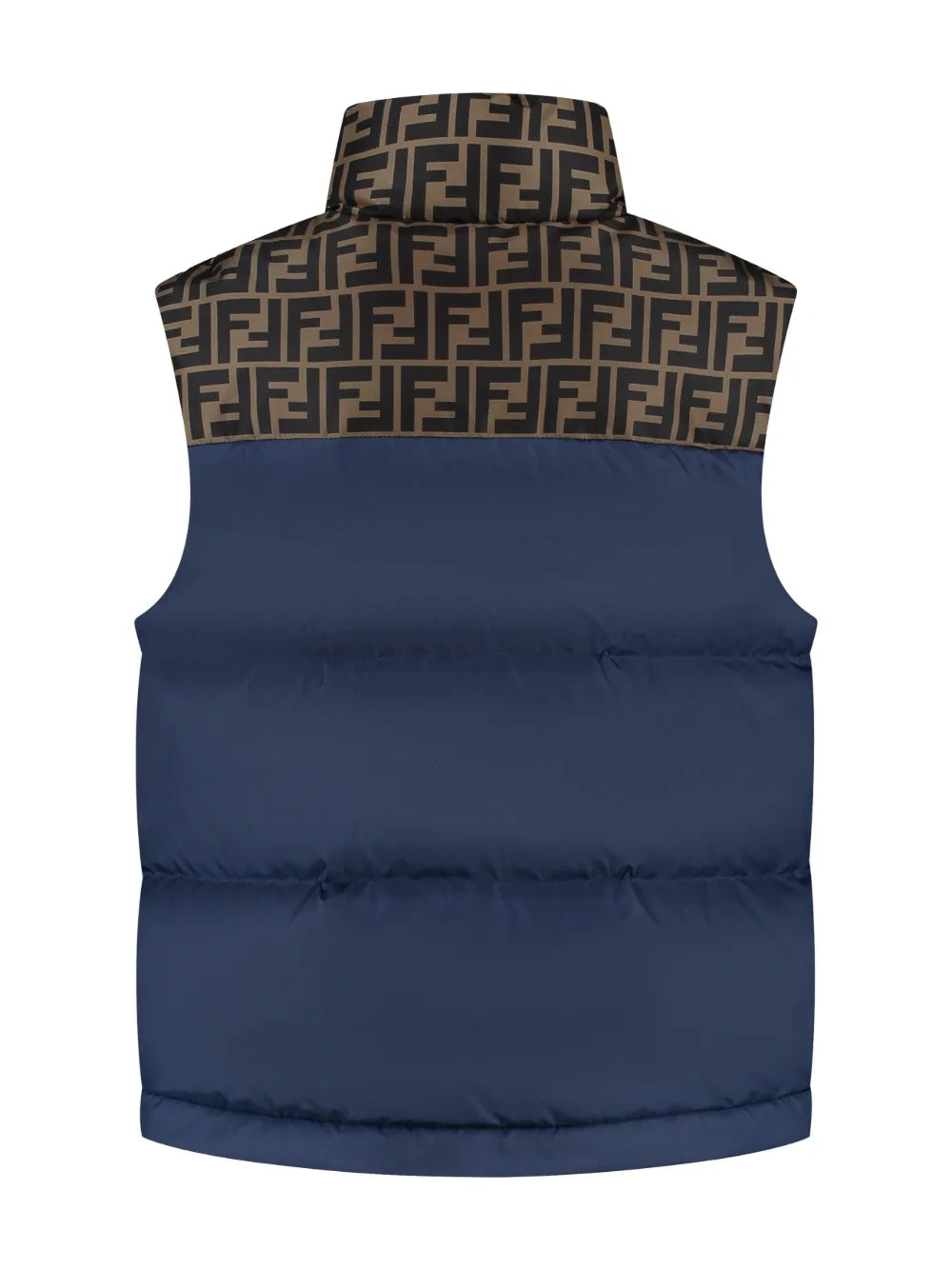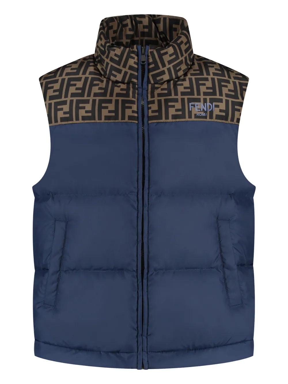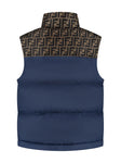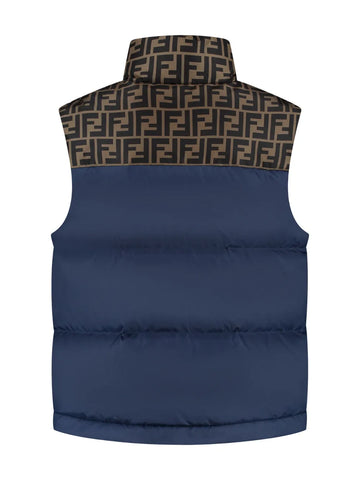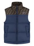 Chaleco acolchado júnior para niño de nylon de la marca Fendi. Chaleco júnior de nylon azul acolchado con detalle del logo FF integral color tabaco en los hombros y en la parte delantera. Dseño acolchado, cuello alto, diseño sin mangas, cierre con cremallera en la parte delantera.