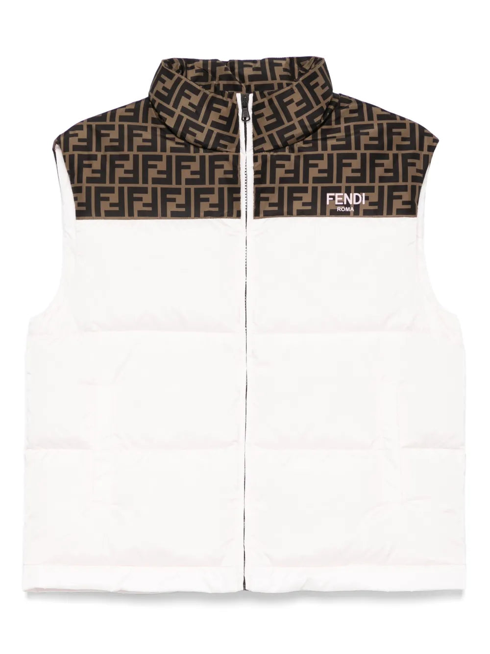 Chaleco acolchado júnior para niña de nylon de la marca Fendi. Chaleco júnior de nylon rosa acolchado con detalle del logo FF integral color tabaco en los hombros y en la parte delantera. Dseño acolchado, cuello alto, diseño sin mangas, cierre con cremallera en la parte delantera. Hecho en Italia.