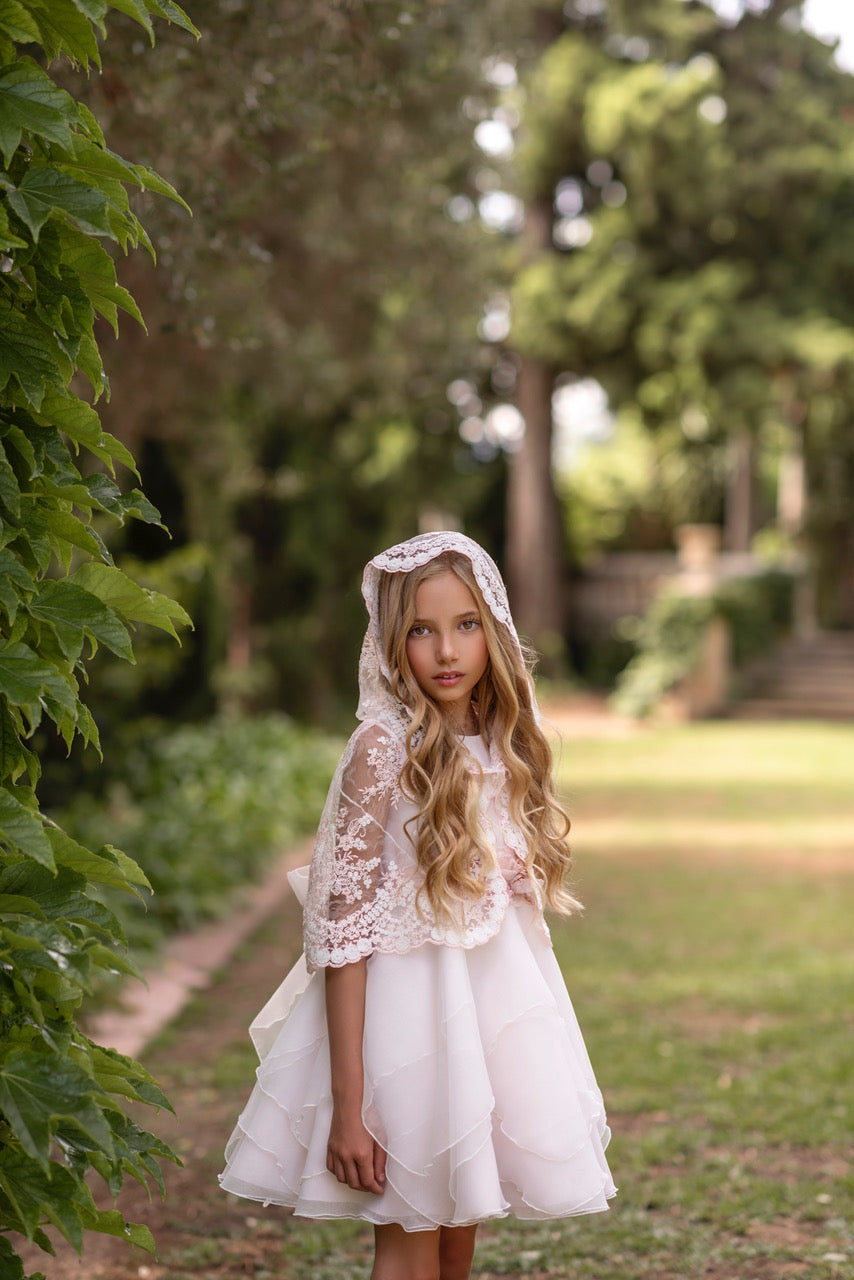 Capa con capucha de la marca Mimilú. Prenda con detalles, sin manga, decorada con encaje de flores blancas del estilo elegante, cuello redondo y manga larga, del color blanco. Chaqueta cómoda y elegante. Ideal para cualquier ocasión. Tela de especial calidad con un diseño formal-casual. Chaqueta de la marca Mimilú, original y memorable para niños y niñas.