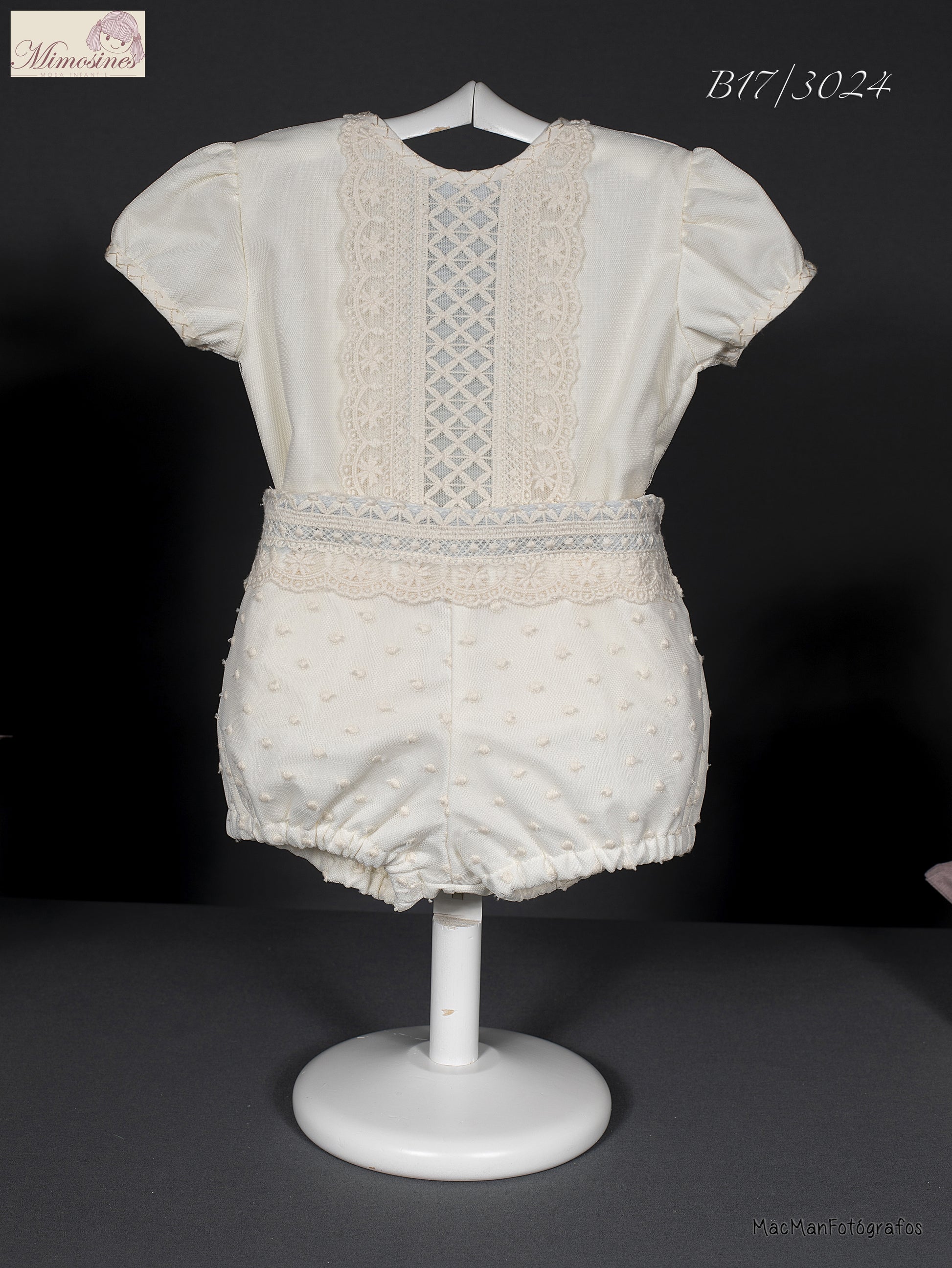 Conjunto para niños para bautizo de color beige, comodo y ligero. Conjunto de manga corta de la tela tul y tul plumeti decorado con el encaje azul.