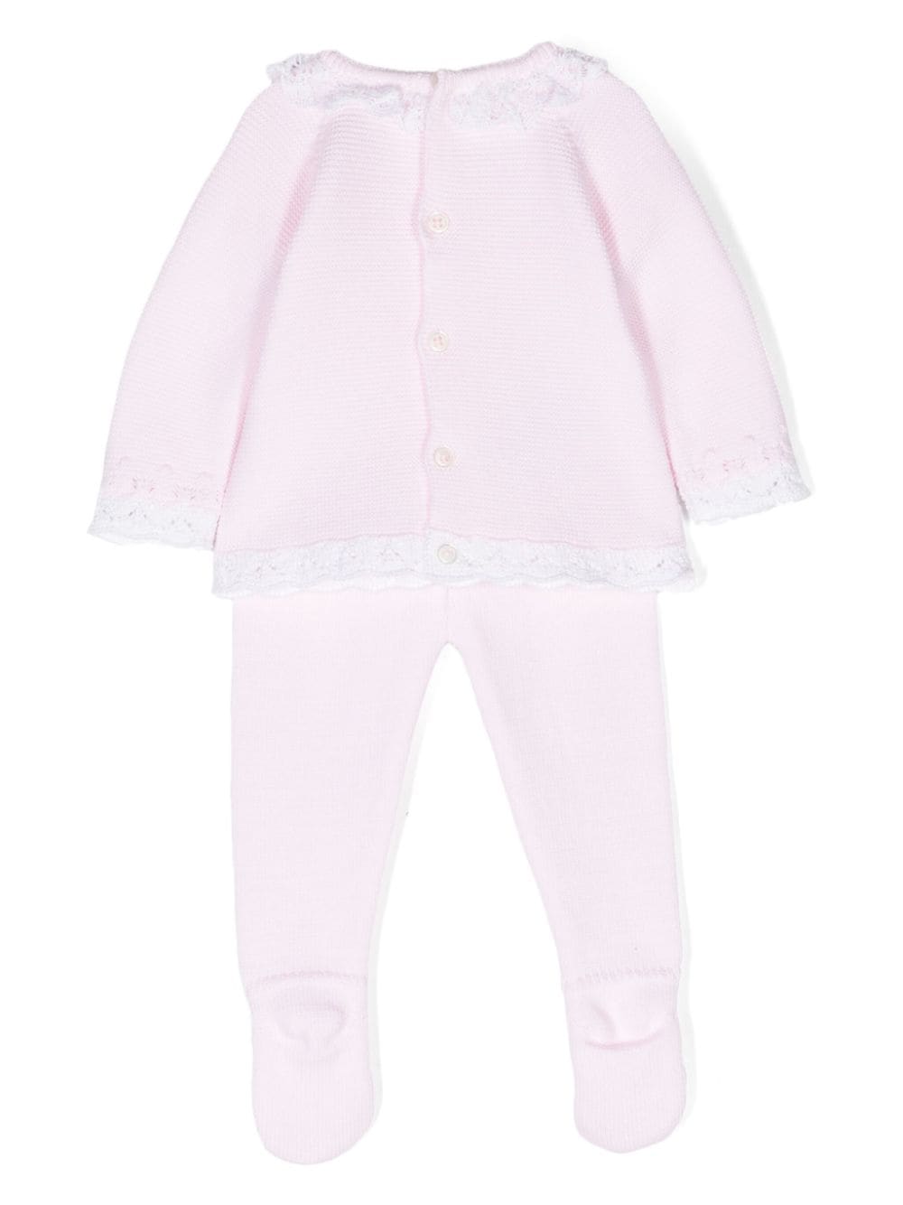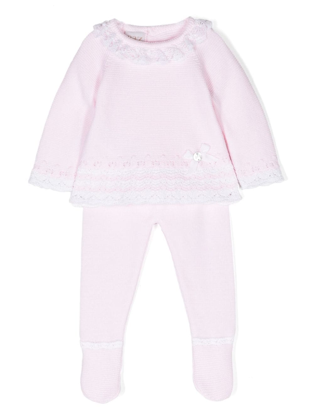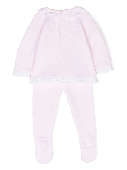 Conjunto de tres - chaqueta, pantalones largos y gorro de la marca Paz Rodriguez. Color rosa/blanco, diseño bordado, detalle de lazo, punto fino, cuello redondo con pechera y volantes del encaje, cierre con botón en la parte posterior, manga raglán larga, puños y dobladillo en contraste, borde festoneado. Gorro de punto calado, placa del logo, decorado con volantes.Ideal para cualquier ocassiones, tambien para regalo. Paz Rodríguez es una marca española mundialmente conocida por sus lujosas colecciones de ropa para bebés y niños con una delicada paleta de colores y un diseño exquisito. Paz Rodríguez ofrece una amplia gama de productos fabricados exclusivamente con materiales de alta calidad y cuidados para los más pequeños.