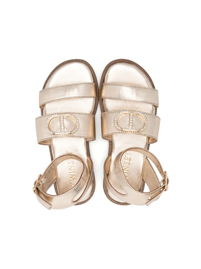 Sandalias con tiras cruzadas de TWINSET. Dorado, piel de becerro, acabado metalizado, diseño de dos vueltas, aplique de cristal, puntera abierta, puntera redonda, tira en el tobillo con cierre con hebilla y suela plana de goma.