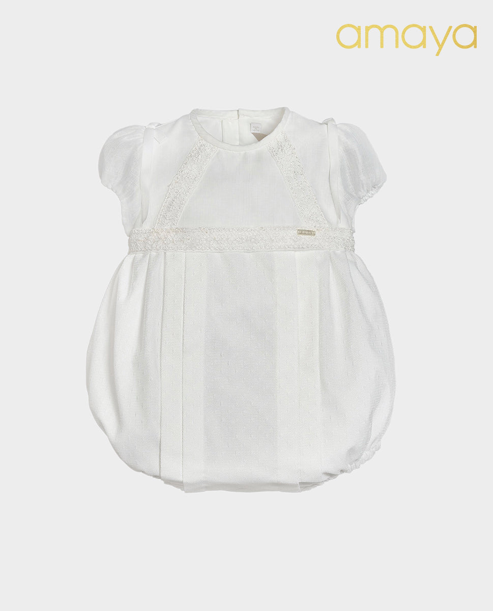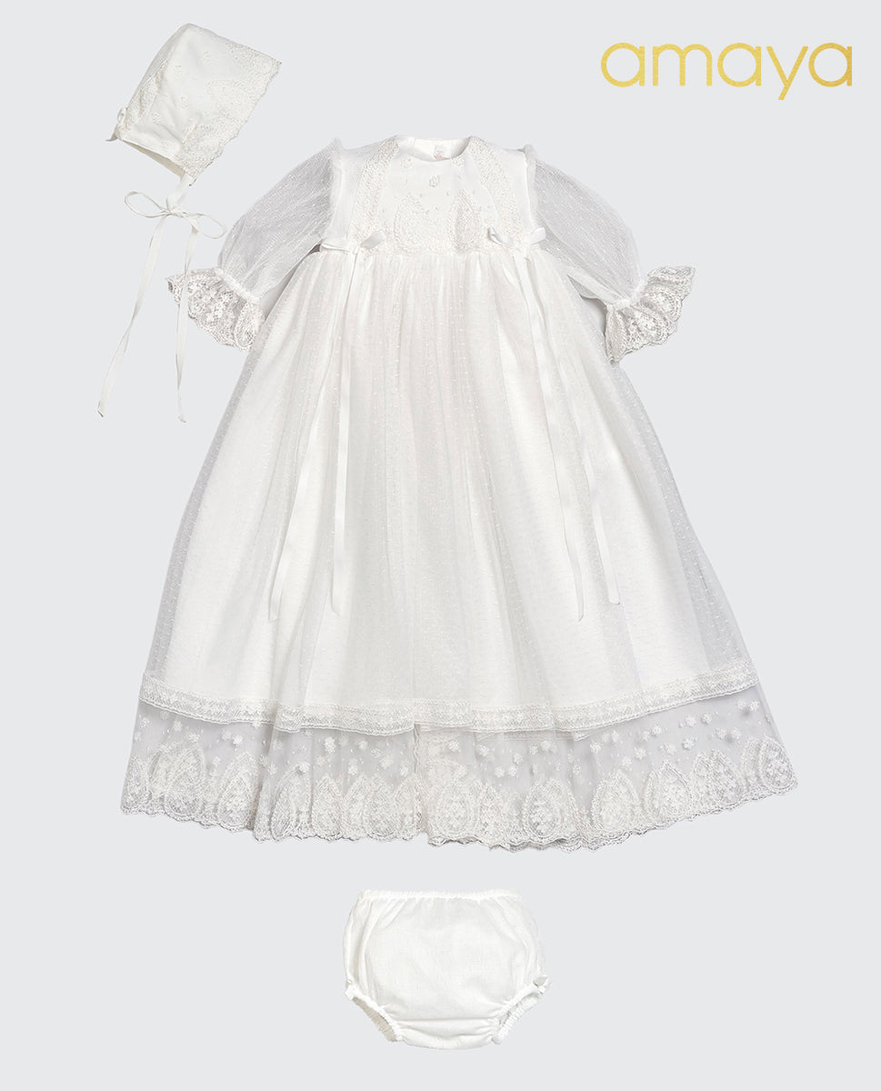Faldón de 3 piezas : capota, faldón y cubre pañal. Todo ello montado en tul plumeti crudo con puntillas a contraste con detalles en tostado y bonitas cintas en lazadas. Para completar el look, tienes varios accesorios a juego como capita, toquilla, zapatitos, babero, chupetero, y pañuelo.