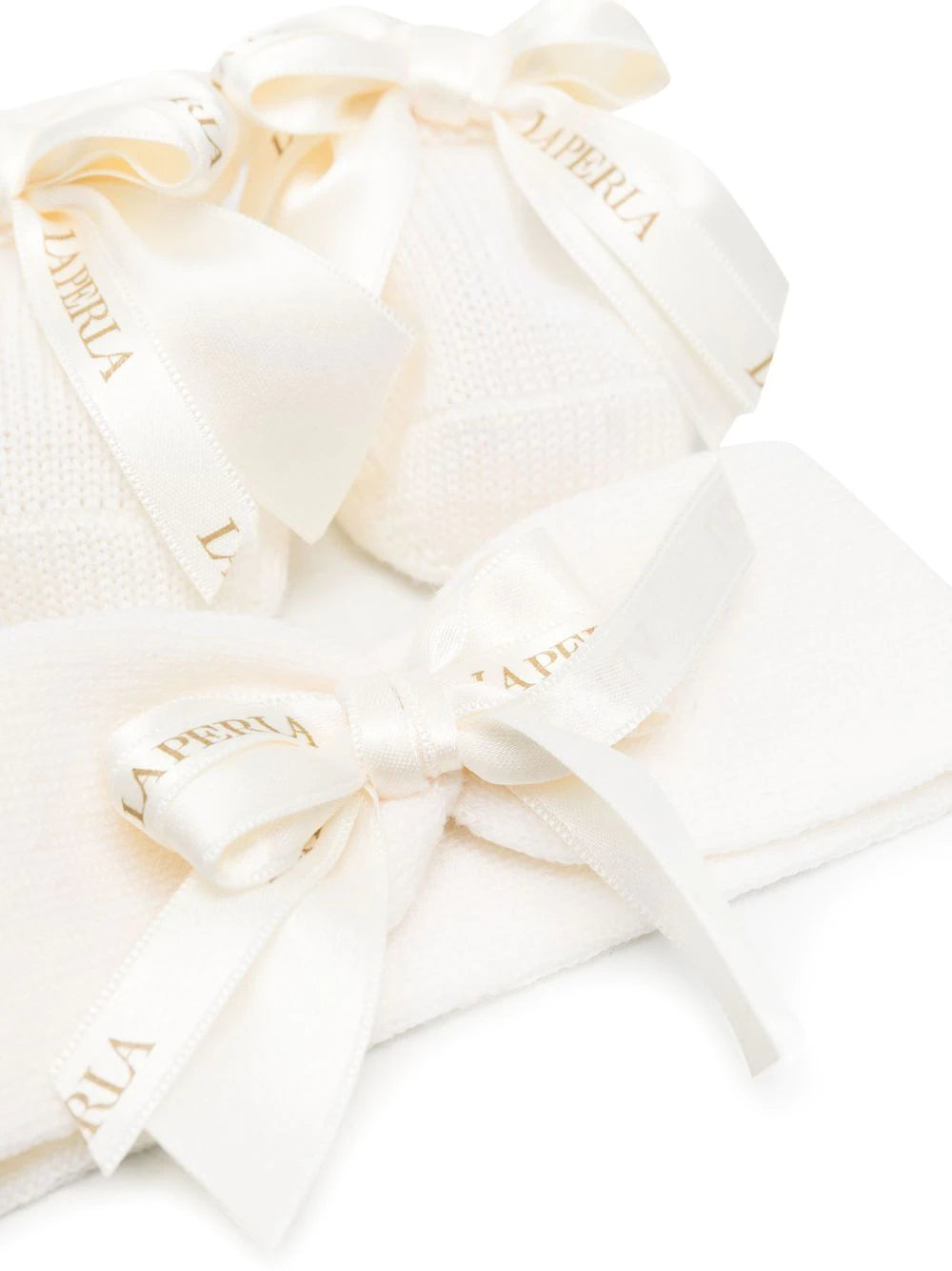 Zapatitos y diadema para bebé niña de la marca La Perla. Color marfil y está decorada con bonitos lazos con estampado La Perla. Cosa para bebé niña será la prenda más comfortable de tu pequeña. Está de algodón suave con puños. La banda es de suave punto de algodón elástico. La Perla es una marca italiana que utilizada exclusivamente materiales naturales como la seda, la cachemira y el lino.