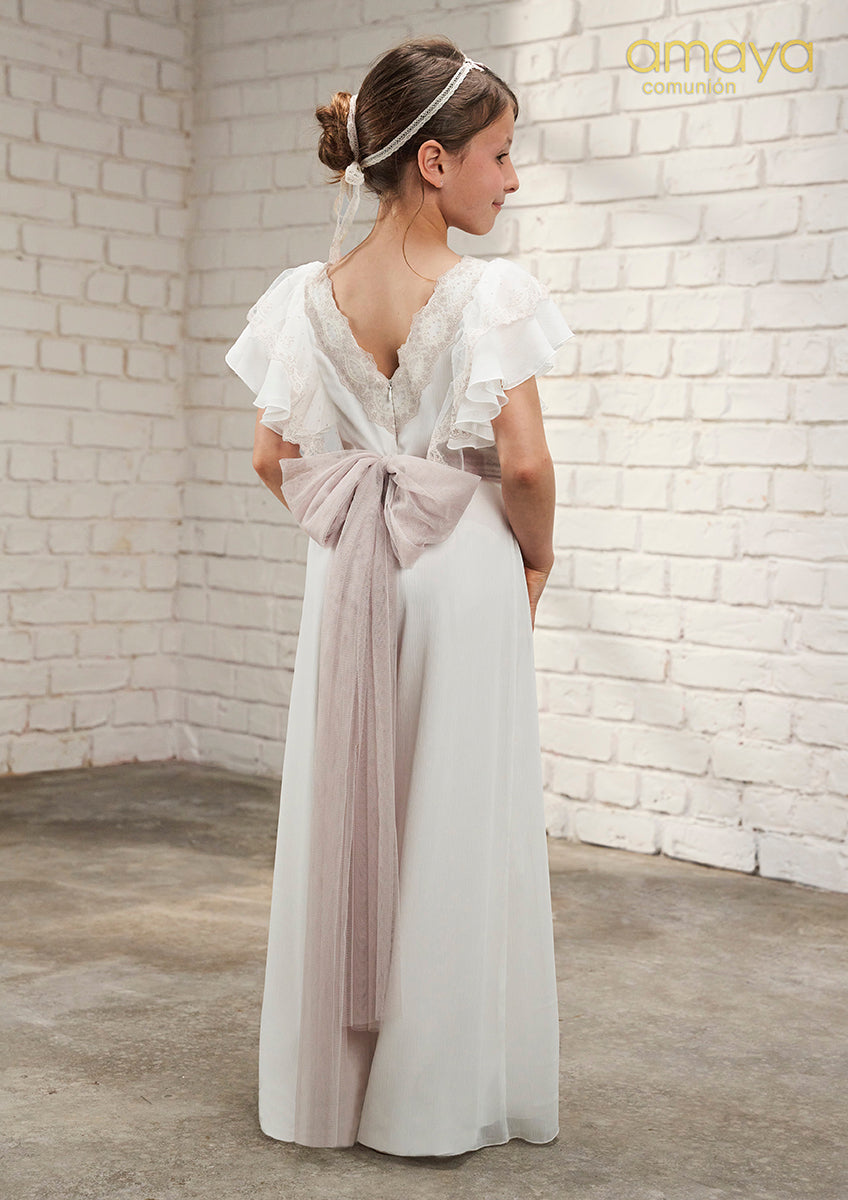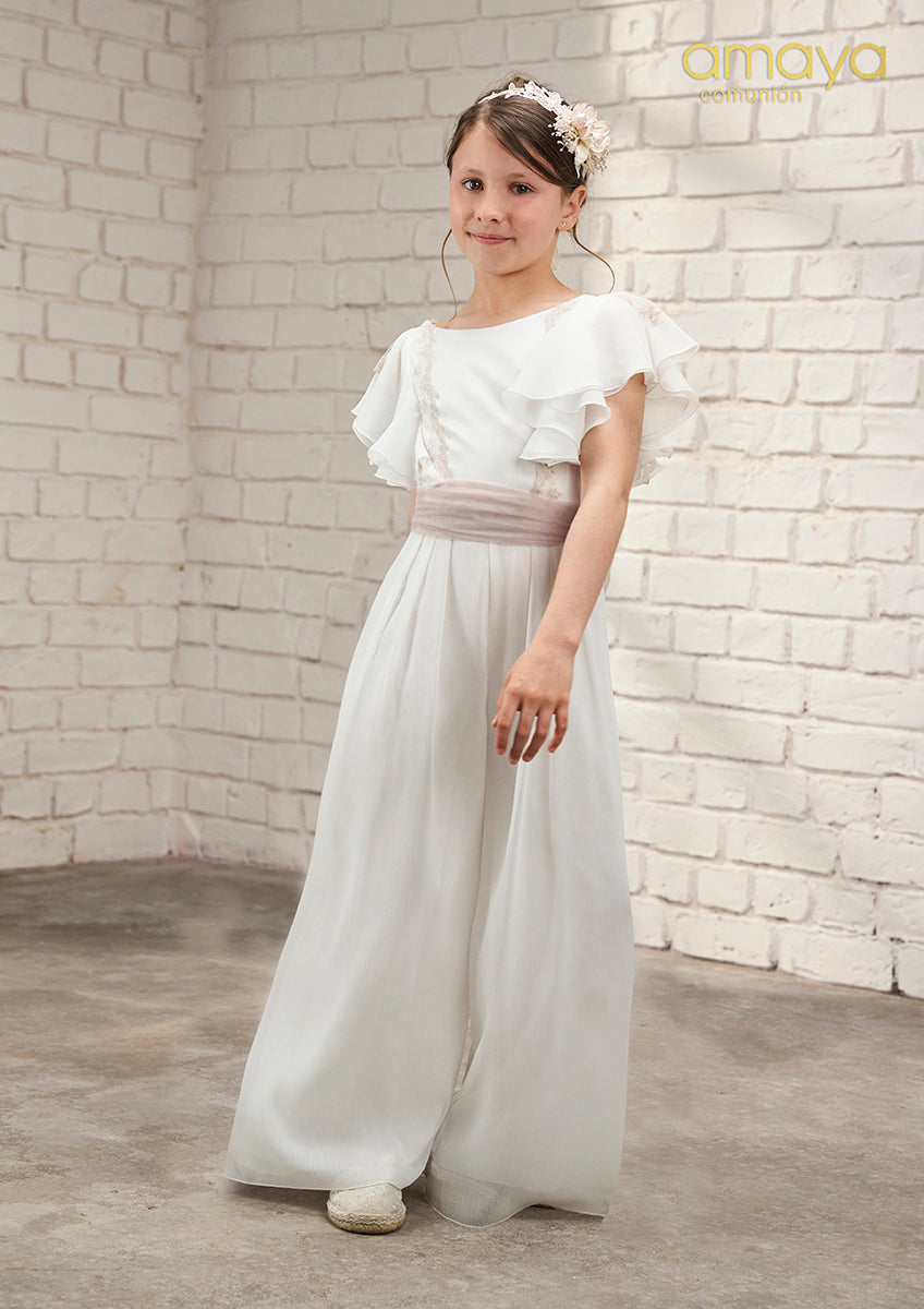 Mono 636049 de comunión en color blanco y beige para niña de la marca AMAYA. Mono sin manga con volantes dobles decorado con encaje beige, cierre con cremallera y lazo de tul de color beige. AMAYA representa siempre el estilo romántico característico de la firma, y como en cada colección, una gran apuesta por la innovación y la artesanía de sus complementos. Corona no está incluida