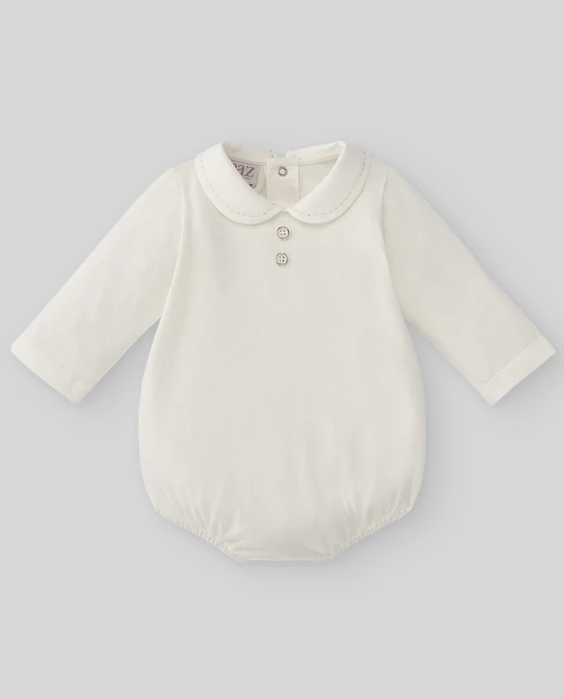 Pelele de la marca Paz Rodriguez. Color blanco leche, algodón, cuello redondo, cierre a presión en la espalda, manga larga. Paz Rodríguez es una marca española mundialmente conocida por sus lujosas colecciones de ropa para bebés y niños con una delicada paleta de colores y un diseño exquisito. Paz Rodríguez ofrece una amplia gama de productos fabricados exclusivamente con materiales de alta calidad y cuidados para los más pequeños.