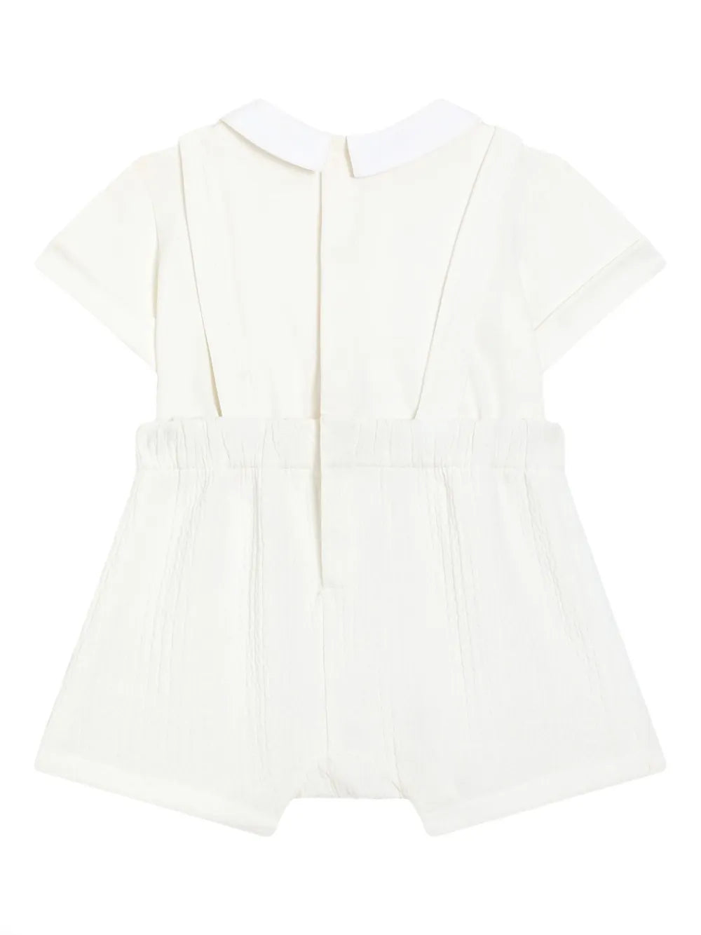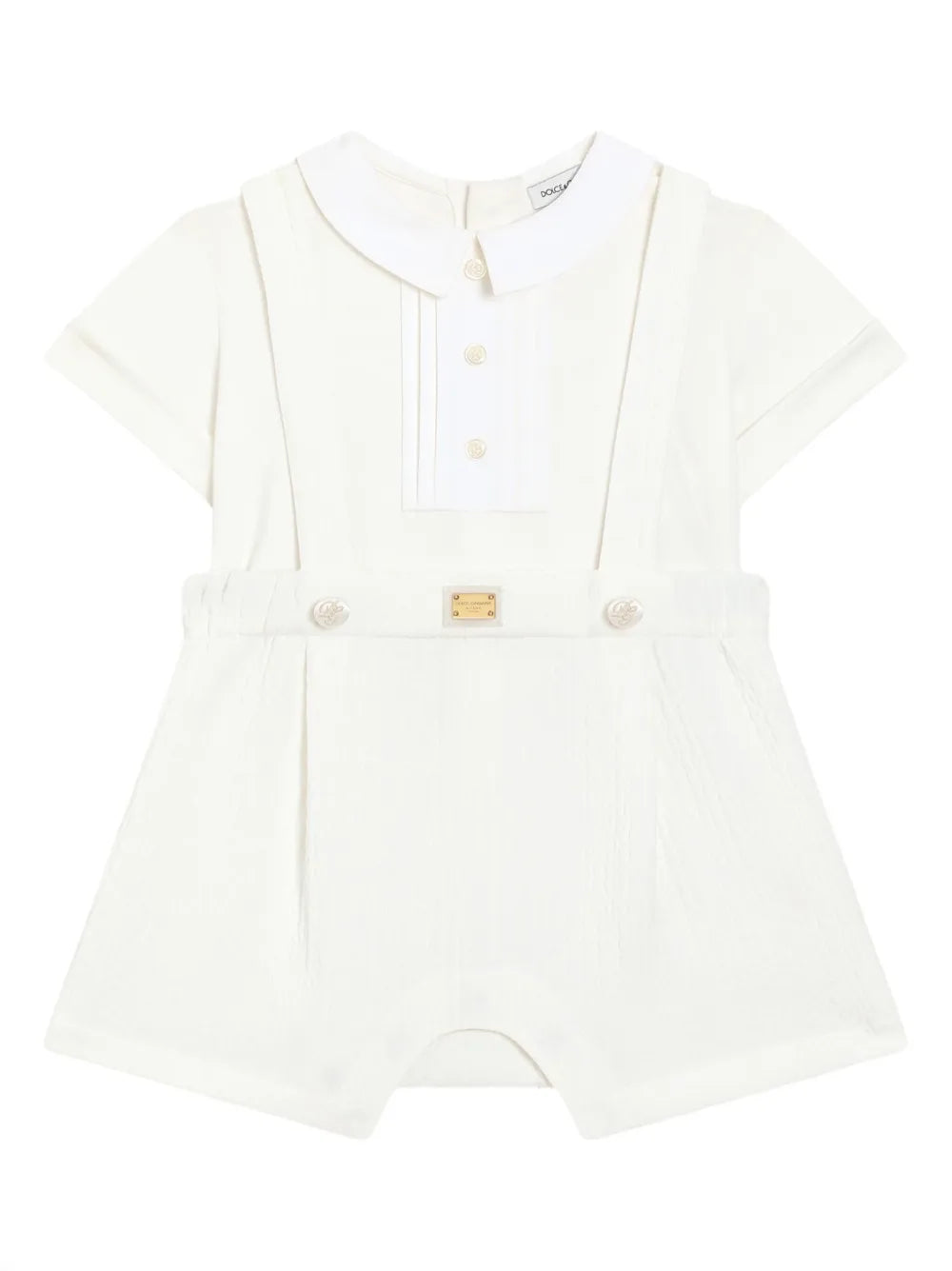 Pelele de interlock de algodón y piqué de punto rombo blanco para bebé niño de la marca Dolce & Gabbana.De color blanco,de algodón, cuello redondo con sobrecuello, manga corta, placa metálica con logotipo, botones forrados de tela con logotipo DG bordado en hilo de lúrex, plastrón frontal con pliegues y botones decorativos, cintura elástica con pinzas,cierre trasero y en el tiro con botones automáticos ocultos. La ropa para niños de la mundialmente famosa marca Dolce & Gabbana refleja las tendencias de la moda para adultos, pero al mismo tiempo mantiene la máxima comodidad y calidad, un diseño exclusivo y un estilo reconocible.