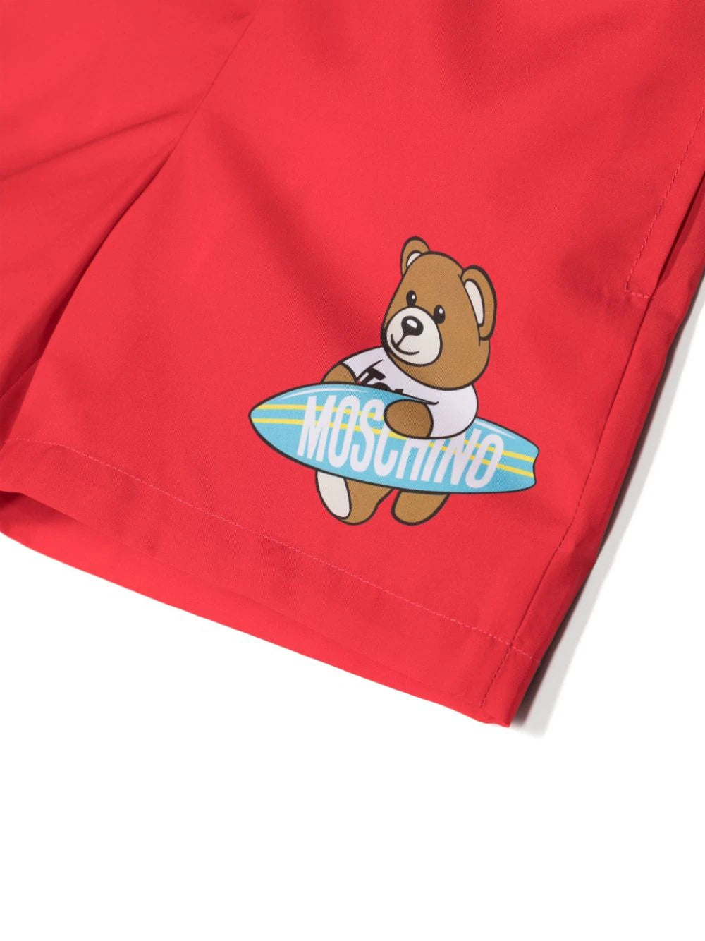 Bañador de la marca Moschino. Prenda con detalles, de color rojo, motivo Teddy Bear característico, estampado gráfico en la parte delantera, pretina elástica con cordón, corte recto,dos bolsillos laterales abiertos. Bañador cómodo y flexible. Ideal para cualquier ocasión. Tela de especial calidad con un diseño formal-causal. Bañador de la marca Moschino, ofrece una imaginación ilimitada de los niños para brindar un estilo excepcional, original y memorable para niños y niñas.