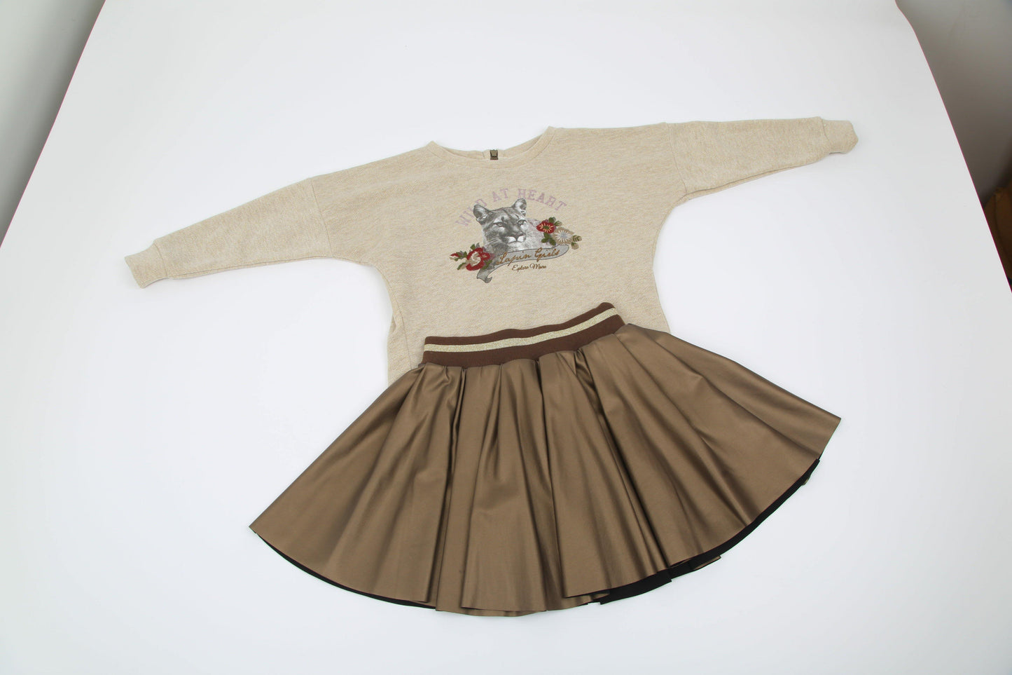 Set de la marca Lapin House. Prenda con detalles, con hilos metalizadps y Print en el centro, con cremallera por detrás y falda en tablones de color dorado. Set completo compuesto de sudadera beige l falda en tablones y canezú elástico, cómodo y sofisticado. Ideal para ocasiones especiales en Otoño-Invierno. Tela de especial calidad con un diseño elegante-formal. Únicamente en color beige y dorado para niñas hasta 12 años. Set de la marca Lapin House, combinación de modestia sofisticada, elegancia y calidad. El cuidadoso desarrollo de los patrones y la gran atención a cada detalle hacen que la ropa de esta marca sea práctica y cómoda