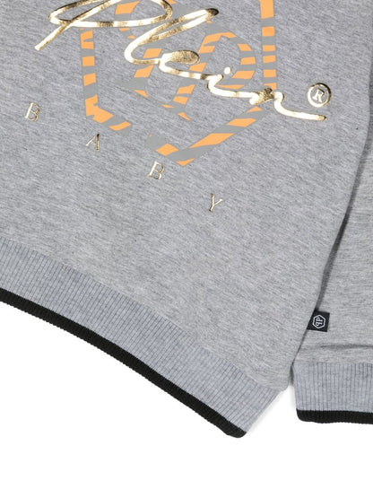 Sudadera de la marca Philipp Plein. Prenda con detalles, con logo en la parte delantera con brillo. Sudadera en color gris con manga larga sin capucha, cálido y flexible. Ideal para cualquier ocasión. Tela de especial calidad con un diseño formal-causal. Sudadera de la marca Philipp Plein, ofrece una imaginación ilimitada de los niños para brindar un estilo excepcional, original y memorable para niños y niñas.son populares en todo el mundo.