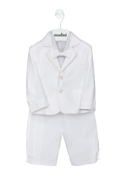 Traje de chaqueta marfil de lino de tela gruesa, camiseta beige de rayas de manga larga y pantalones largos del color marfil, con corbata de moño del mismo estilo. Traje cómodo y flexible. Ideal para cualquier ocasión. Tela de especial calidad con un diseño formal-causal. Traje de la marca MANUELL&FRANK, ofrece una imaginación ilimitada de los niños para brindar un estilo excepcional, original y memorable para niños y niñas son populares en todo el mundo.