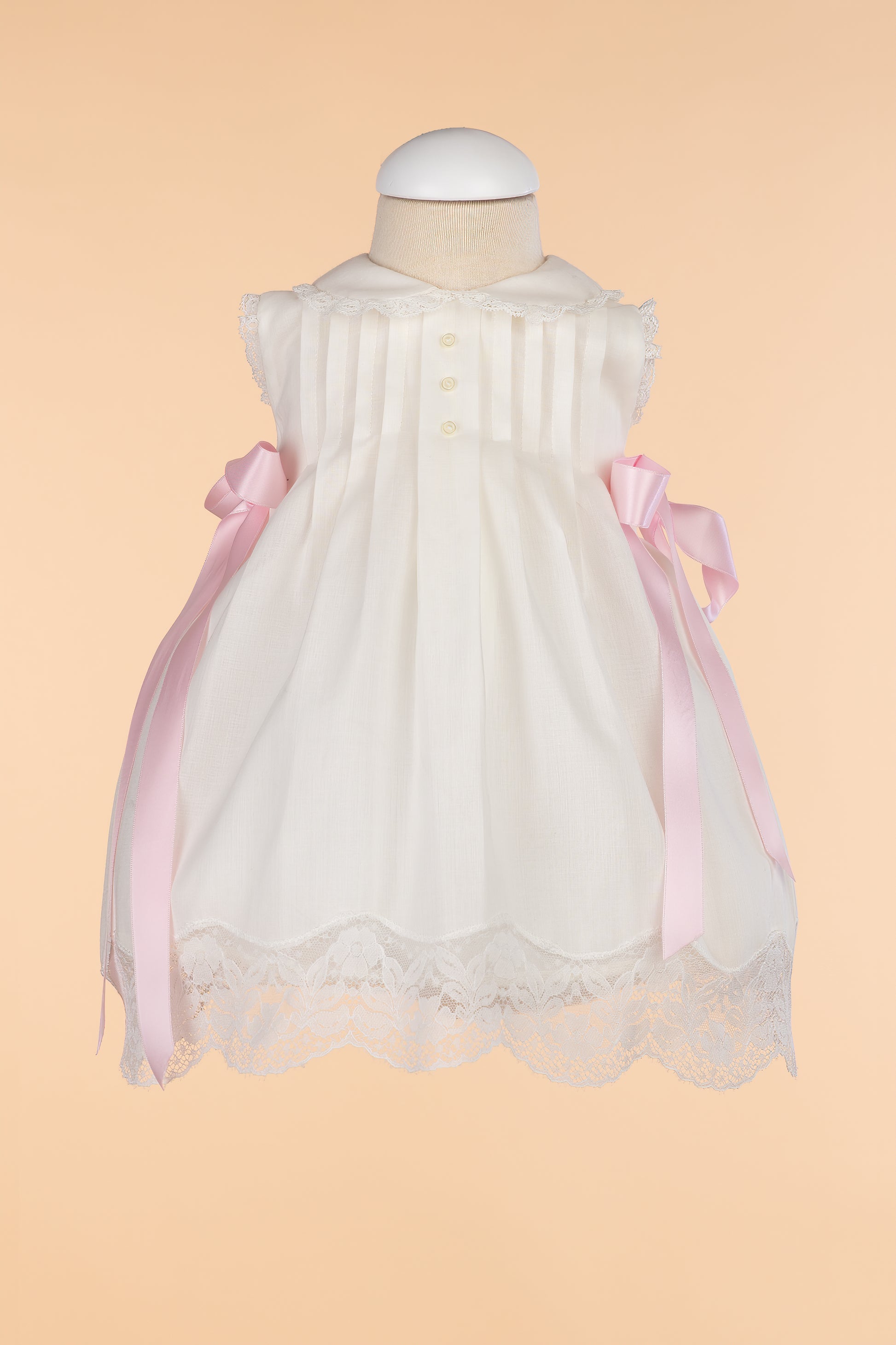 Vestido Valencien de Bautizo de color crudo, con lazados crudos (diferente de la foto), cómodo y ligero. Vestido sin mangas y de media falda, decorada con el encaje