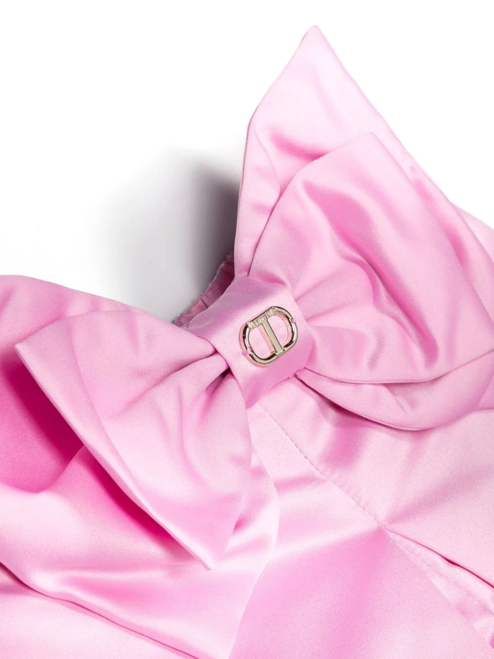 Set de camiseta y pantalones con motivo de lunares de la marca TWINSET. De color rosa y blanco, algodón stretch, camiseta sin mangas corta, puños con volantes,tejido de satén, cuello redondo,dobladillo redondeado,estilo pull-on,pantalones cortos con placa del logo,detalle de lazo oversize, diseño ancho,cinturilla elástic, cierre con cremallera lateral oculta,detalle plisado. Tela de especial calidad con un diseño formal-casual. Camiseta de la marca Twinset, original y memorable para niños y niñas.