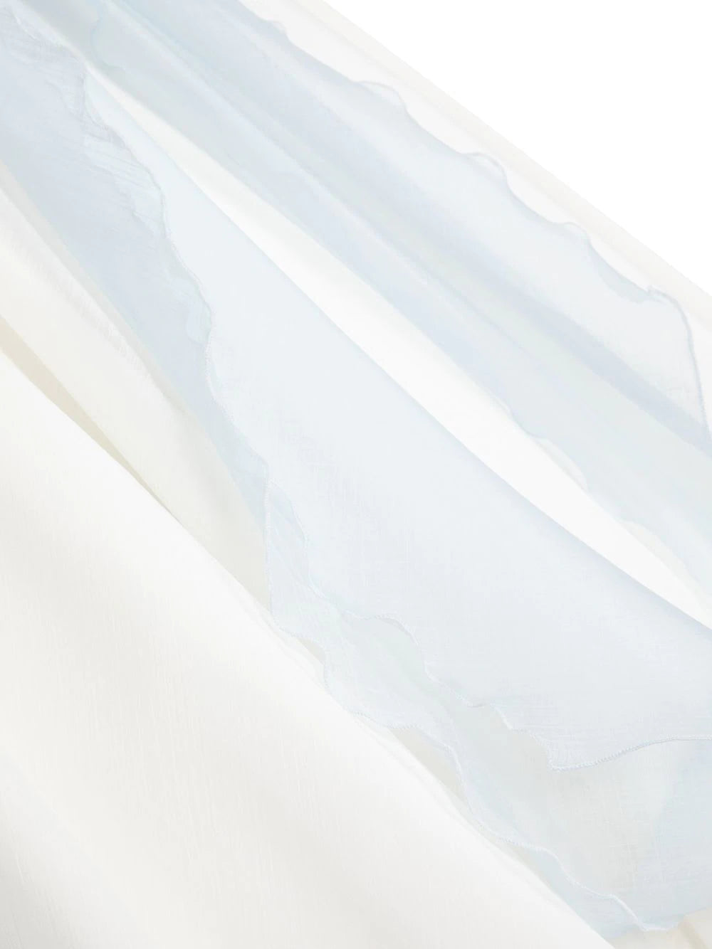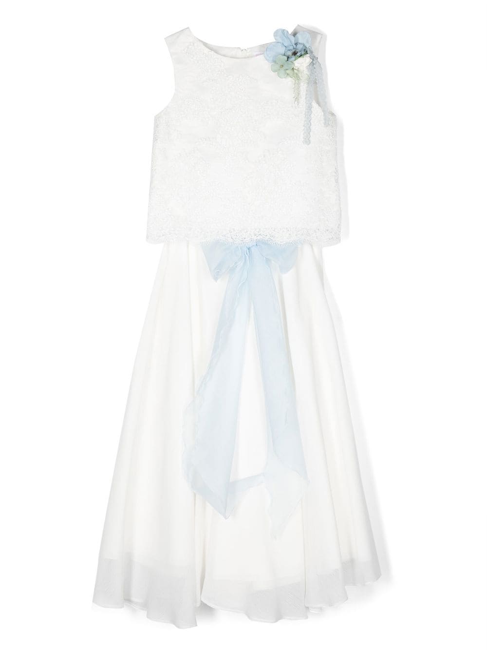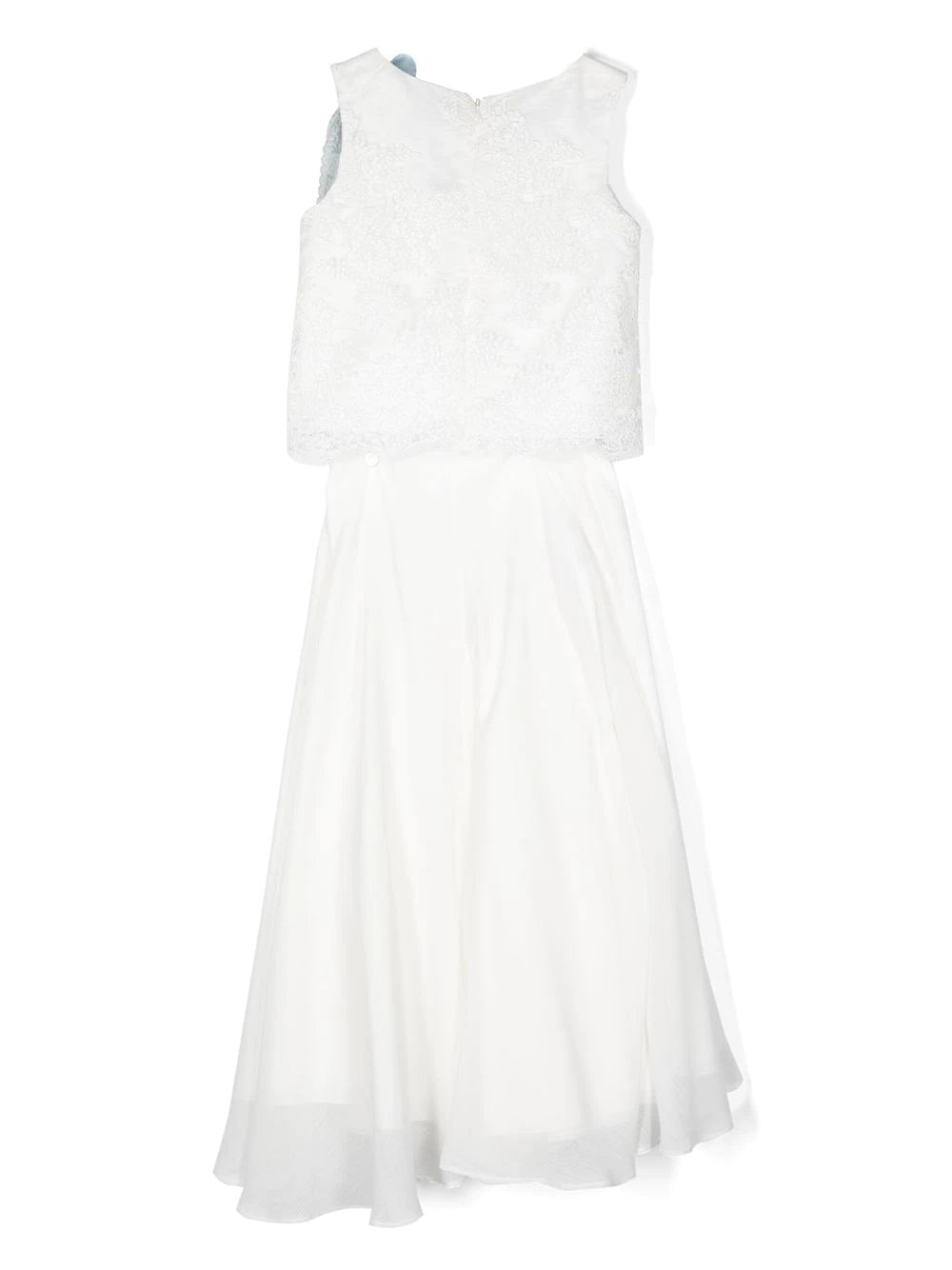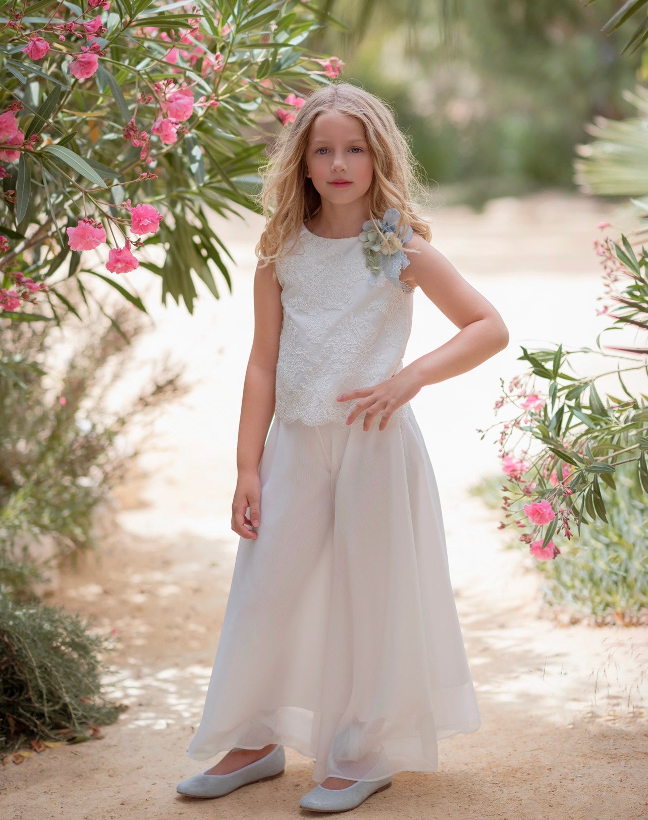 Set de pantalón largo tul blanco y camiseta sin mangas guipur con la flor azul claro. Set de dos piezas, blusa sin mangas lleva el broche con la flor decorativa de color azul clarito del estilo exclusivo y elegante. Set con pantalones blancos de tul y de ambiente de lujo. Set elegante de la marca Mimilú se fabrican únicamente a partir de alta calidad. Los mejores diseñadores y fabricantes de vestidos y trajes de comunión esfuerzan para crear vestidos de comunión, fabricación artesanal en España.