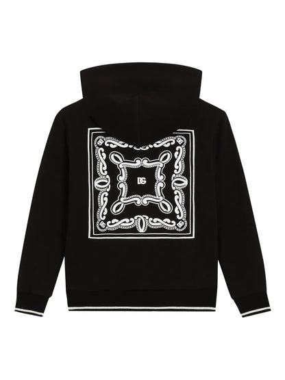 Sudadera negra de algodón con capucha y estampado Bandana engomado en la espalda. Manga larga con puño acanalado. Placa metálica con logotipo. La ropa para niños de la mundialmente famosa marca Dolce & Gabbana refleja las tendencias de la moda para adultos, pero al mismo tiempo mantiene la máxima comodidad y calidad, un diseño exclusivo y un estilo reconocible.
