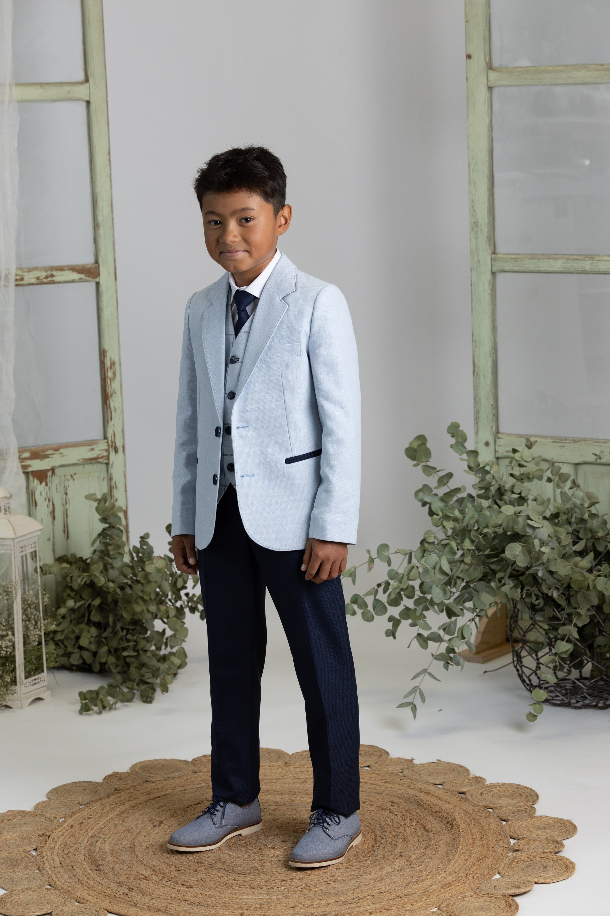 Traje completo con americana celeste de la marca Amalio Rubio. Set completo compuesto de americana celeste, chaleco, camisa blanca elegante ,pantalones y corbata azul marino. Traje cómodo y delicado. Tela de especial calidad con un diseño elegante-formal. Los diseñadores de moda esfuerzan para tener en cuenta las necesidades de los niños al máximo, creando una confortable y práctica pieza para niños a la vez que se distingue por la belleza y la elegancia.