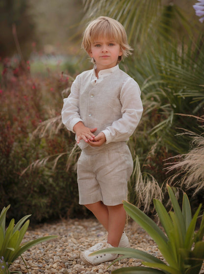 Traje completo en color beige de lino de la marca Mimilú. Set completo compuesto de chaleco beige, camisa blanca elegante y pantalones cortos beige . Traje cómodo y delicado. Ideal para ocasiones especiales de Primavera-Verano. En la tienda lo tenemos en color beige. Tela de especial calidad con un diseño elegante-formal. Los diseñadores de moda esfuerzan para tener en cuenta las necesidades de los niños al máximo, creando una confortable y práctica pieza para niños a la vez que se distingue por la belleza y la elegancia.