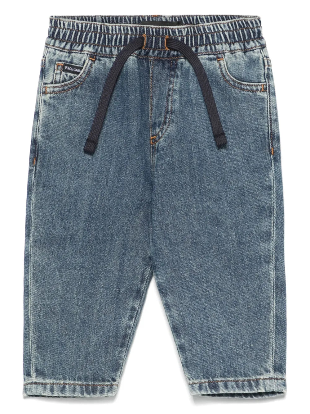 Vaqueros de algodón azul para bebé niño Dolce & Gabbana. Cintura elástica con cordón ajustable, bragueta decorativa. La ropa para niños de la mundialmente famosa marca Dolce & Gabbana refleja las tendencias de la moda para adultos, pero al mismo tiempo mantiene la máxima comodidad y calidad, un diseño exclusivo y un estilo reconocible.
