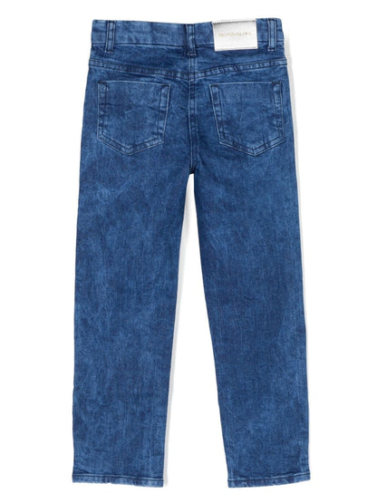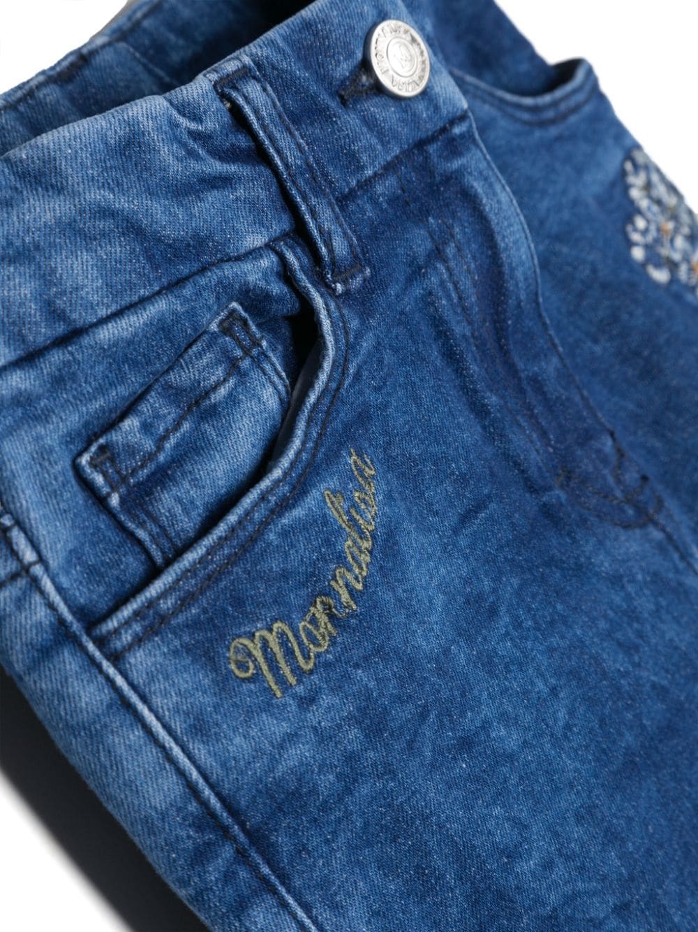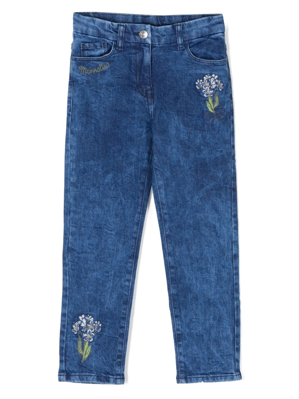 Azul, algodón stretch, tela vaquera, logo bordado, parche del logo en la parte posterior, bordado floral, cierre con botón y cremallera en la parte delantera, trabillas, diseño clásico de cinco bolsillos y corte recto.