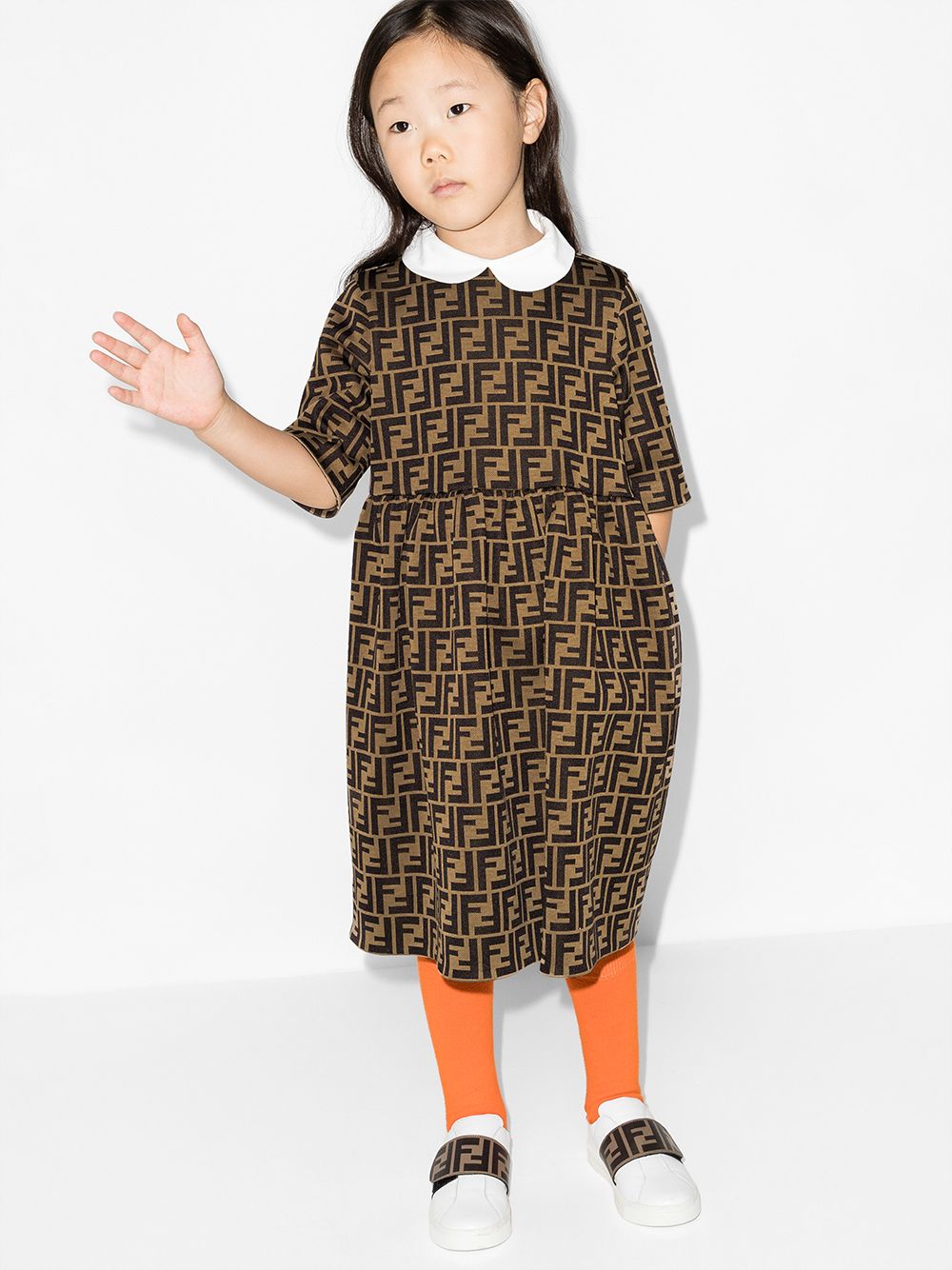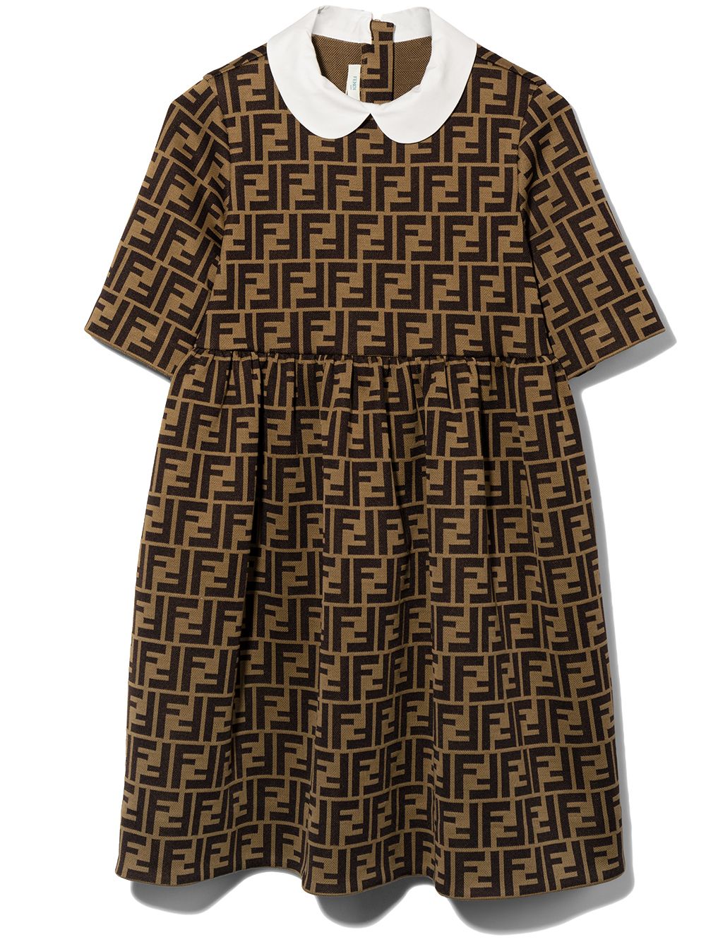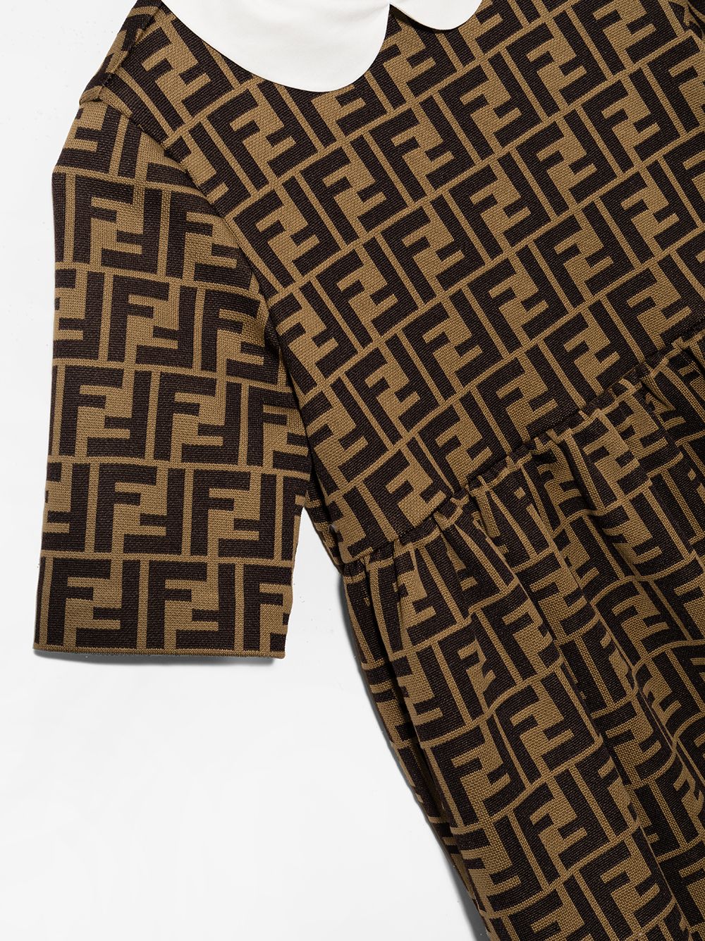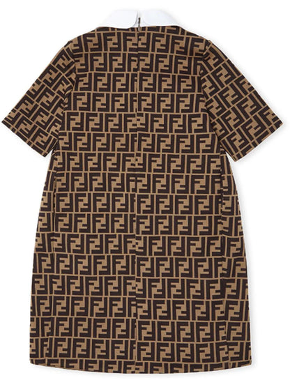 Vestido con motivo del logo FF de color marrón de Fendi Kids con cuello blanco, manga corta y cierre oculto en la parte trasera. Fendi Kids tiene una impresión de marca reconocible, popular en todo el mundo. Las colecciones infantiles repiten modelos para adultos, combinan lujo y comodidad.