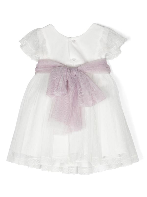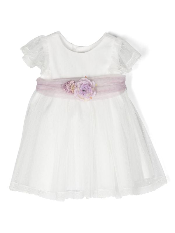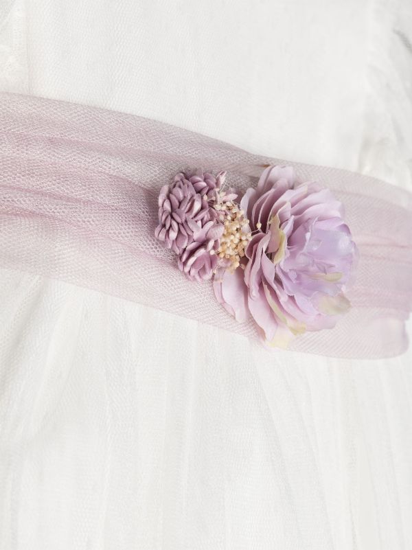 El vestido de ceremonia de la marca AMAYA. Prenda con detalles, diseñada con los tejidos más dulces. Está confeccionado en tul plumetti, lleva las flores en el lazo de la cintura de color malva. El vestido sin mangas decorado con volantes de encaje, en color blanco y la espalda cerrada. AMAYA representa siempre el estilo romántico característico de la firma, y como en cada colección, una gran apuesta por la innovación y la artesanía de sus complementos.