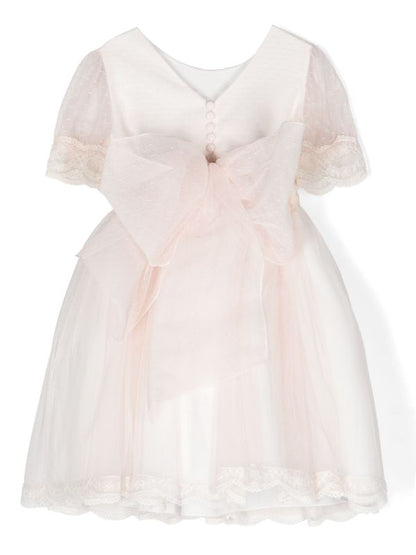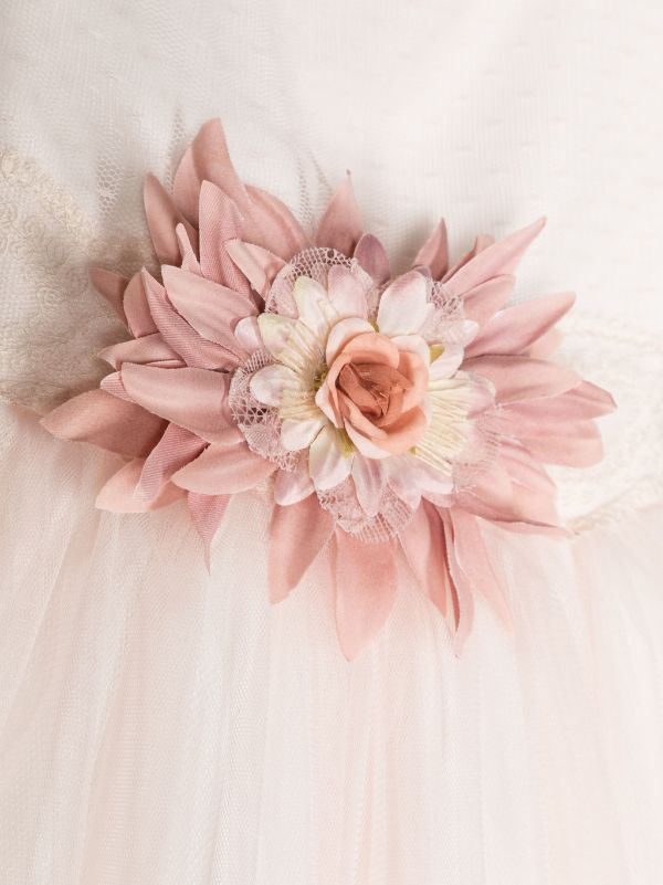 El vestido de ceremonia en color rosa para niña de la marca AMAYA. El vestido de manga larga decorada con bordado del estilo elegante, de cuello redondo con la tul plumetti en parte arriva y de espalda abierta, decorado con flores en la cintura con ambiente de lujo. El vestido de la falda larga acabada con bordado 3 capas tipo cancán para mantener su forma. AMAYA representa siempre el estilo romántico característico de la firma, y como en cada colección, una gran apuesta por la innovación y la artesanía de sus complementos.