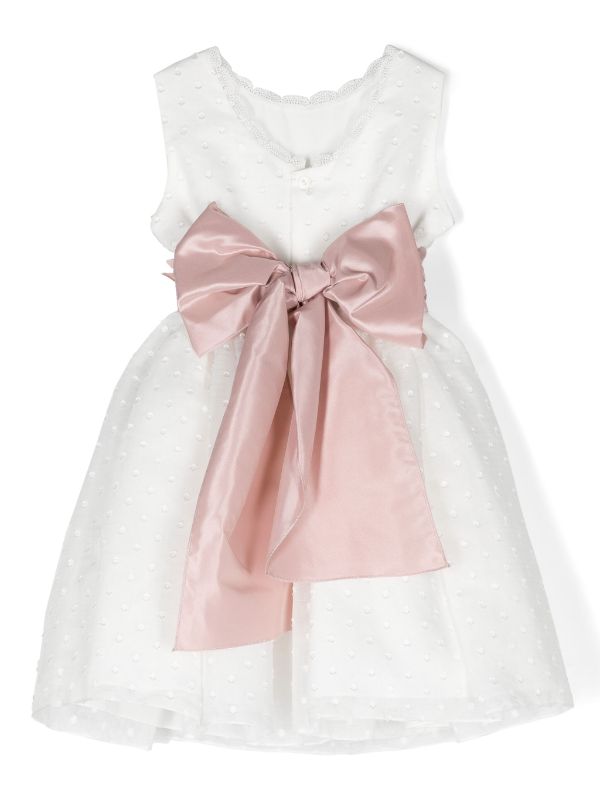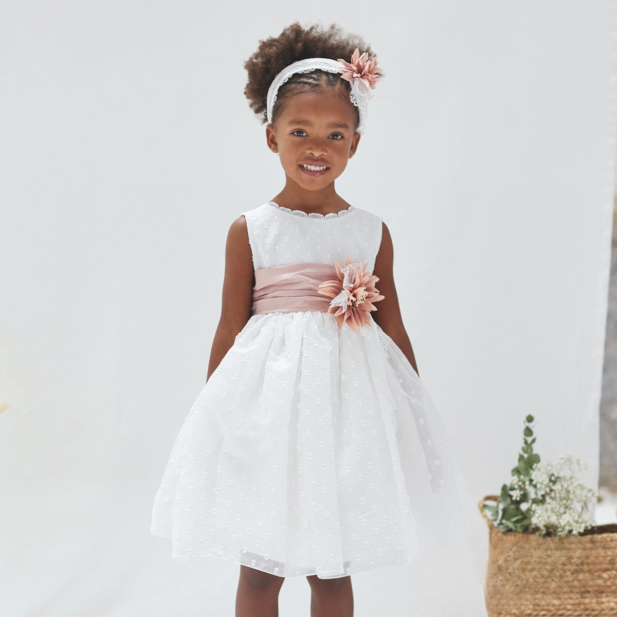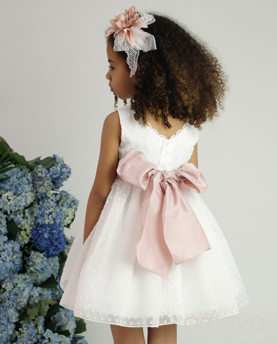 El vestido de ceremonia de la marca AMAYA. Prenda con detalles, diseñada con los tejidos más dulces. Está confeccionado en tul bordado, lleva las flores en la cintura de color rosa-crudo. El vestido sin mangas, decorado con encaje alrededor de cuello, en color blanco y con la tela plumetti y la deslumbrante espalda que tiene escote abierto, con una falda de la tela plumetti ligera y vaporosa de muchas capas. AMAYA representa siempre el estilo romántico característico de la firma, y como en cada colección, una gran apuesta por la innovación y la artesanía de sus complementos.