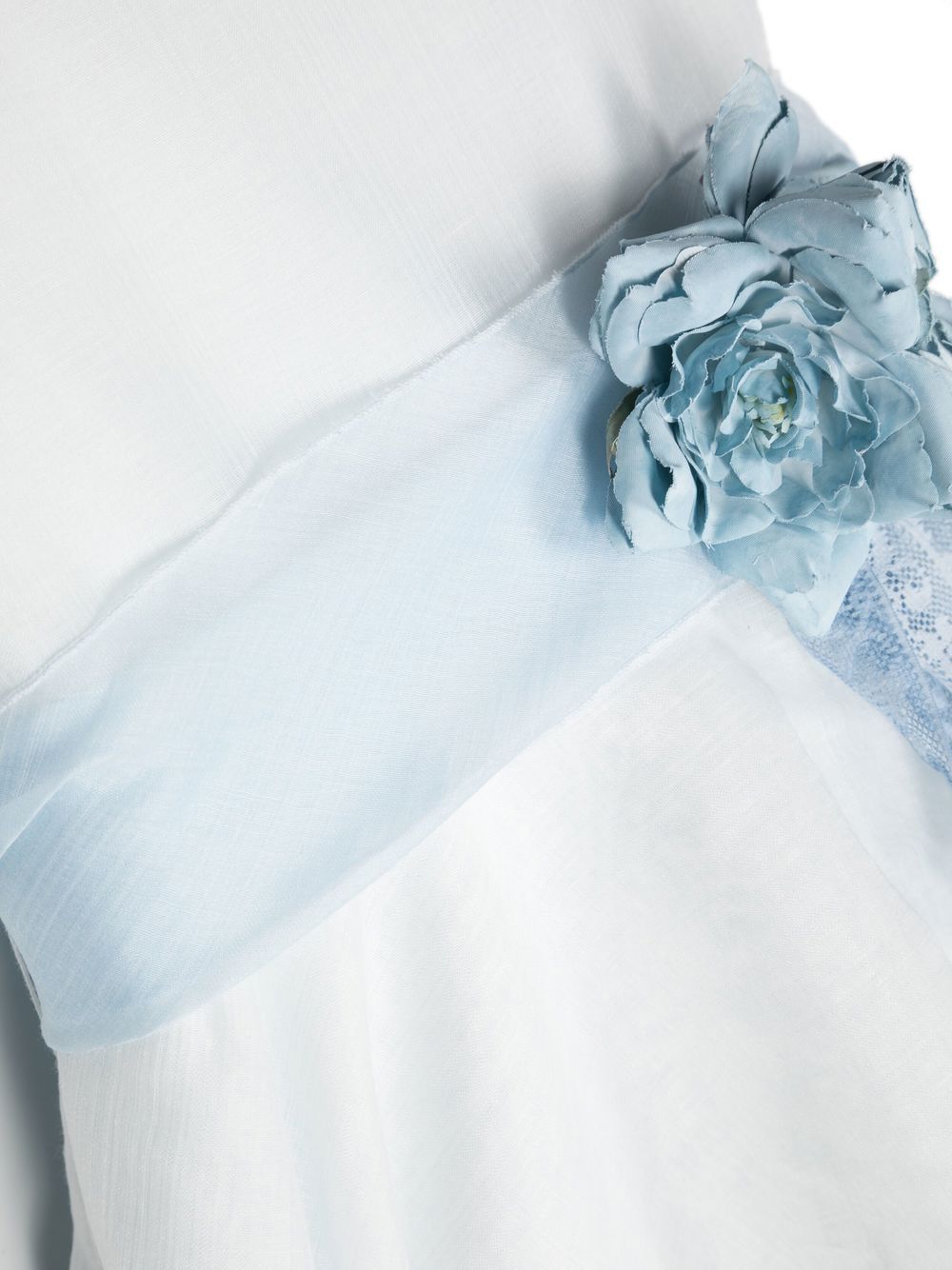 El vestido de ceremonia del color azul, sin manga, con una falda larga y vaporosa. Es una prenda con el lazo de tul en la cintura y con flores grandes de color azul en el centro . El vestido tiene la falda ligera que mantiene su forma, del estilo elegante y de ambiente de lujo. Vestido de la marca Mimilú se fabrican únicamente a partir de alta calidad. Los mejores diseñadores y fabricantes de vestidos de comunión esfuerzan para crear vestidos de ceremonia, fabricación artesanal en España.