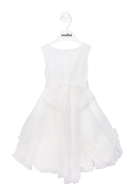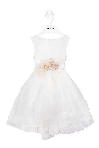 El vestido de ceremonia de color crudo, sin manga, con una falda corta y vaporosa de volantes. Es una prenda con detalles como el lazo de tul en la cintura con las flores en el centro del estilo exclusivo y elegante. El vestido tiene la falda de dos capas de ambiente de lujo. Vestido elegante de la marca Mimilú se fabrican únicamente a partir de alta calidad. Los mejores diseñadores y fabricantes de vestidos de comunión esfuerzan para crear vestidos de comunion, fabricación artesanal en España.