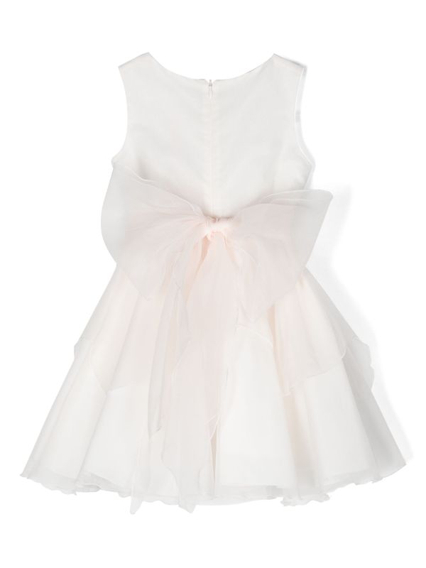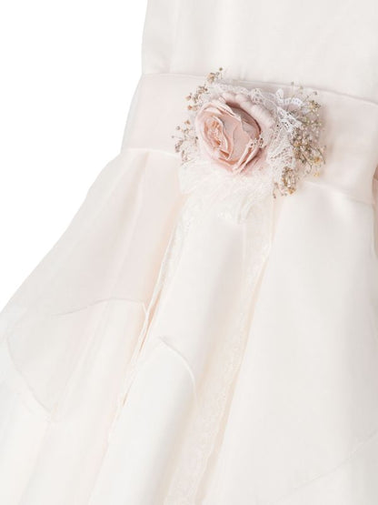 El vestido de ceremonia de color rosa clara, sin manga, con una falda corta y vaporosa de volantes. Es una prenda con detalles como el lazo de tul en la cintura y con las flores en el centro del estilo exclusivo y elegante. El vestido tiene la falda de muchas capas de ambiente de lujo. Vestido elegante de la marca Mimilú se fabrican únicamente a partir de alta calidad. Los mejores diseñadores y fabricantes de vestidos de comunión esfuerzan para crear vestidos de comunion, fabricación artesanal en España.