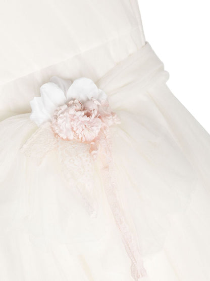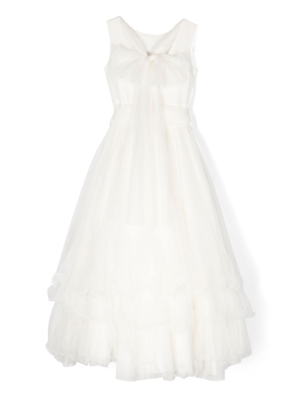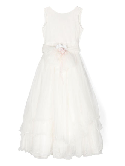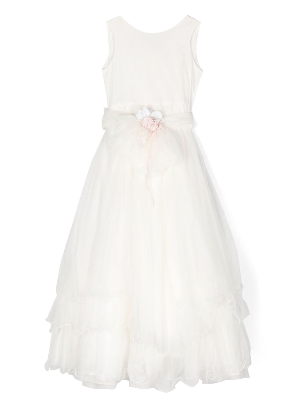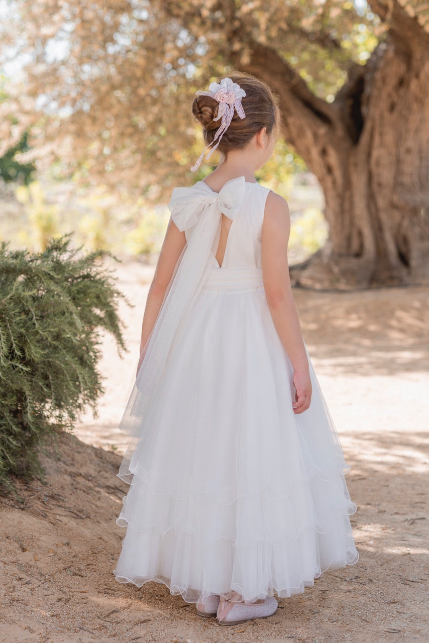 El vestido de comunión de color blanco roto, sin manga, con una falda larga y vaporosa de volantes. El vestido con la espalda abierta decorada un lazo elegante con su diseño exclusivo, lleva una falda de volantes transparentes que caen en 5 capas para dar el efecto de princesa. El vestido tiene una flor de color rosa/blanco para estilizar el lazo que rodea en la cintura y que se anuda en la parte delantera. Vestido elegante de la marca Mimilú se fabrican únicamente a partir de alta calidad. Los mejores diseñadores y fabricantes de vestidos de comunión esfuerzan para crear vestidos de comunión, fabricación artesanal en España.