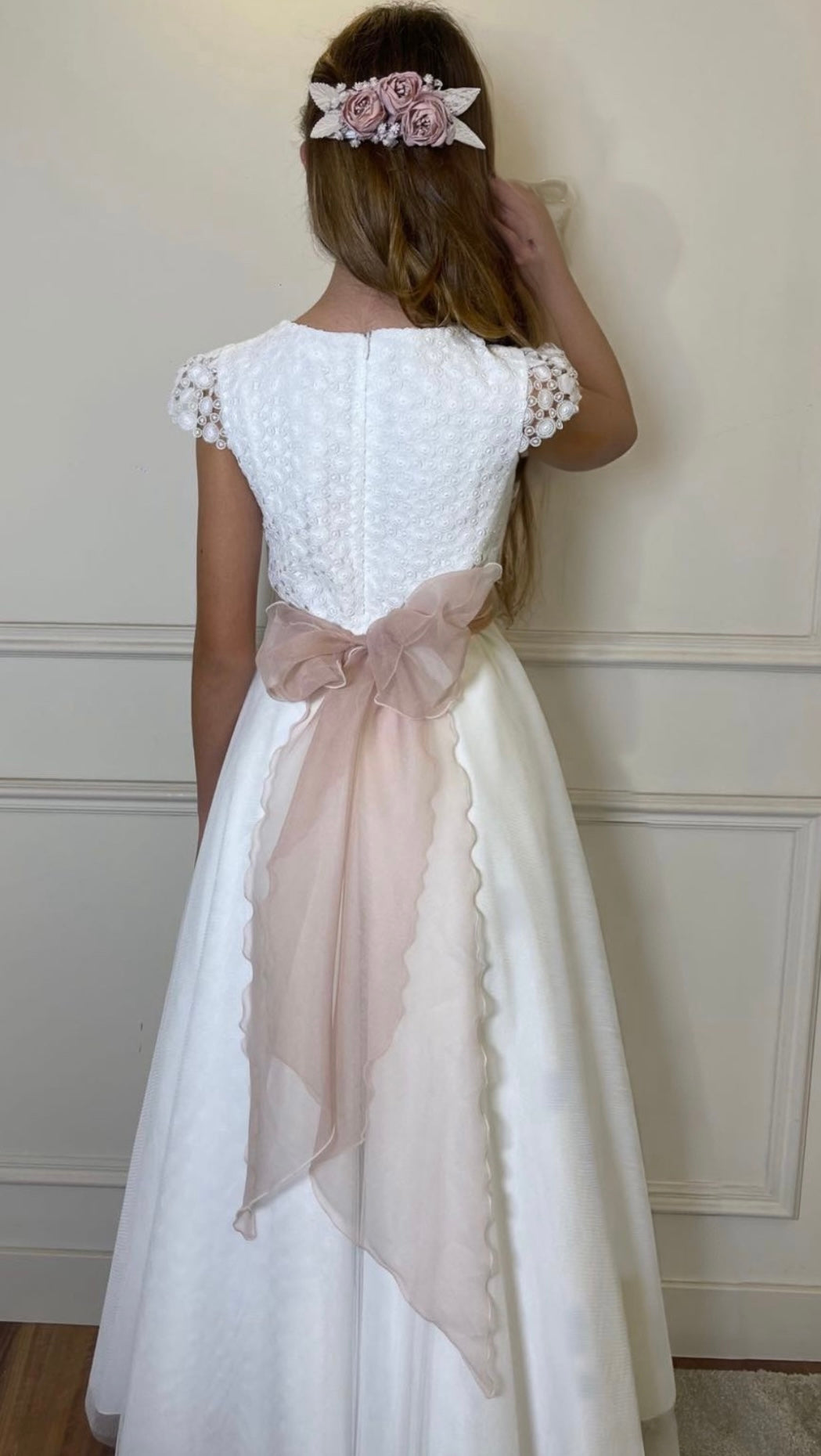 El vestido de comunión de color blanco, con manga corta, con una falda larga. El vestido con la espalda cerrada, decorada con encaje, espalda cierra con cremallera oculta, manga corta de tela transparente, bordado de encaje, vestido con un lazo elegante de color rosa con su diseño exclusivo, decorado con flores de color rosa. Vestido elegante de la marca Mimilú se fabrican únicamente a partir de alta calidad. Los mejores diseñadores y fabricantes de vestidos de comunión esfuerzan para crear vestidos de comunión, fabricación artesanal en España.