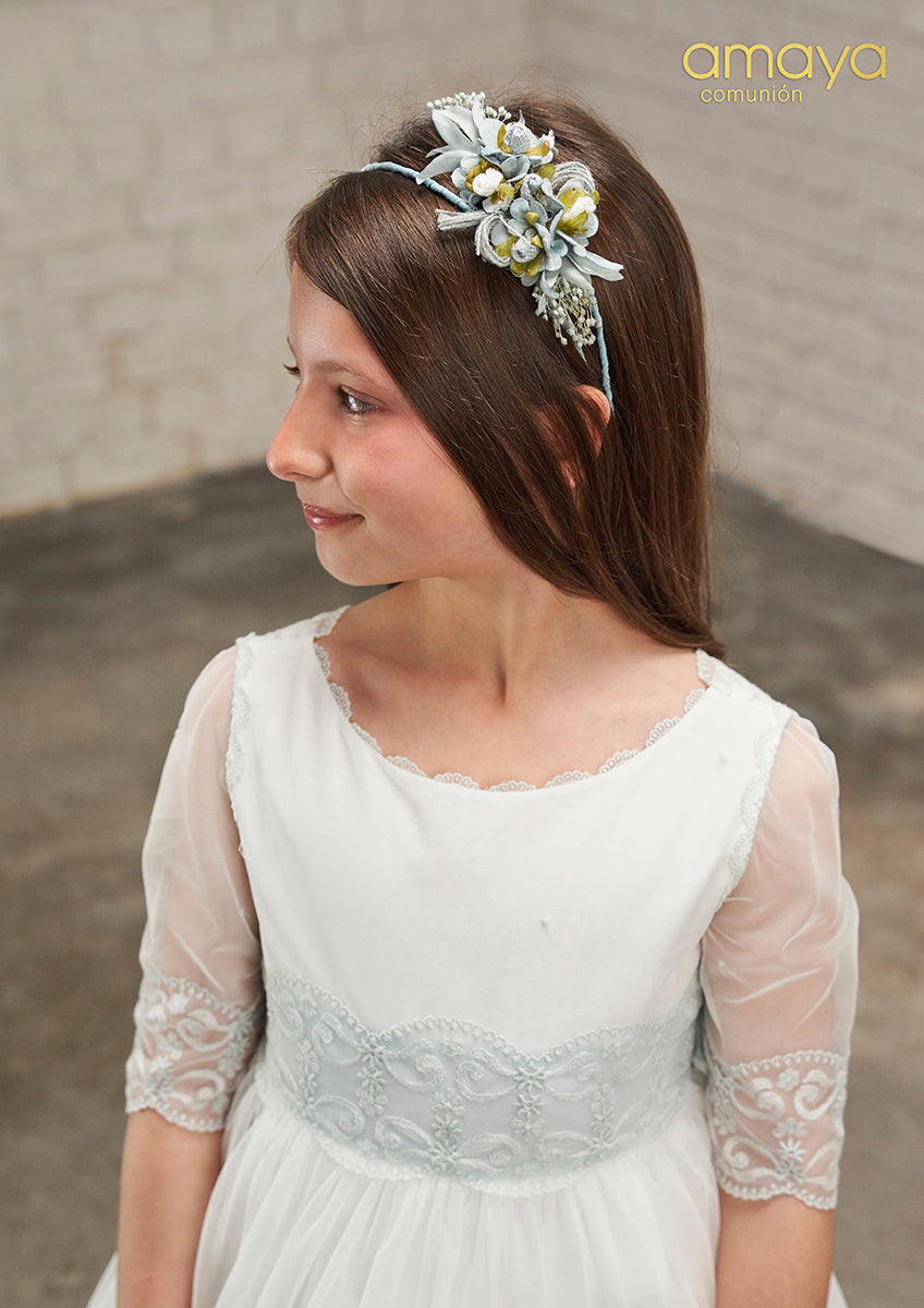 El Vestido de comunión en color blanco y verde agua para niña de la marca AMAYA. El Vestido con manga larga bordada y escote redondo delante y escote V bordado detras. El cinturón bordado de color verde agua y un lazo en la espalda. El Vestido de la falda larga de 3 capas tipo cancán para mantener su forma. AMAYA representa siempre el estilo romántico característico de la firma, y como en cada colección, una gran apuesta por la innovación y la artesanía de sus complementos. Corona y flor del cinturon no están incluidos