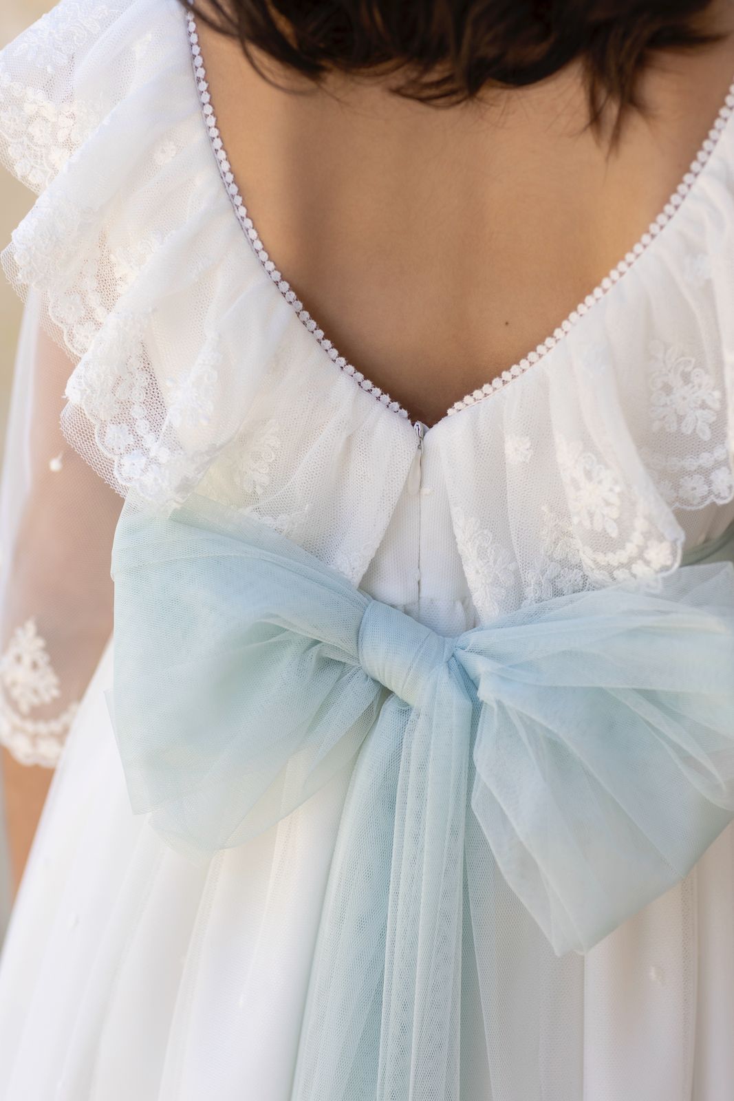 El vestido de comunión MUSGO de la marca ALHUKA. Un vestido de comunión de color blanco con encaje ,de manga larga transparente, decorada encaje, con una falda larga que calle hasta el suello. Por bajo lleva un tul bordado. Vestido con espalda abierta decorada con encaje y volantes, cierre con cremallera oculta, decorado con unas flores en la cintura hechas a mano de color azul.