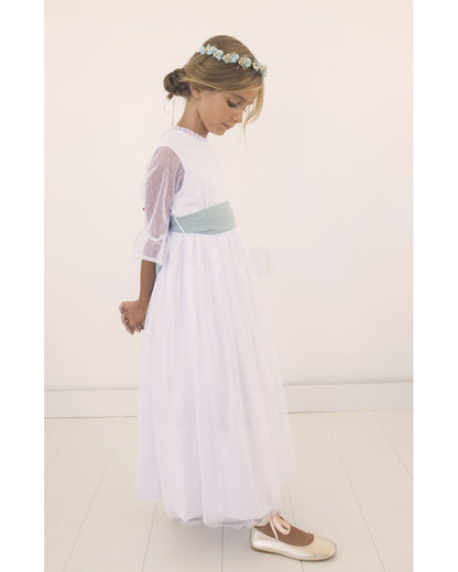 El vestido de comunión para niña de manga larga tul plumetti transparente y de doble capa de color blanco con la espalda cerrada con la cremallera y con lazada de tul verde aguamarina (recomendable) cómodo y delicado. Puede cambiar el lazo por el lazo de cualquier color con su corona de flores. Vestido elegante de la marca Petritas, se fabrican únicamente a partir de alta calidad en España, de acuerdo con el concepto creativo exclusivo de la marca.