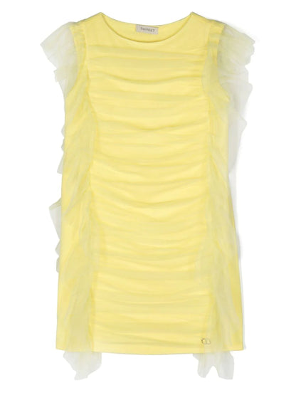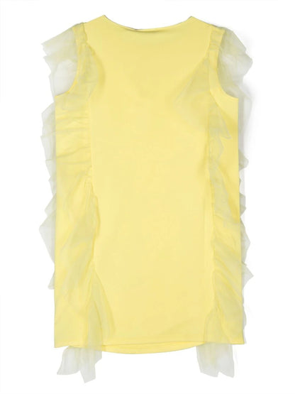 Vestido de la marca Twinset. Prenda con detalles, de color amarillo/limón, cuello redondo decorado con tela de tul, con volantes, sin manga, dobladillo recto. Ideal para cualquier ocasión. Tela de especial calidad con un diseño formal-casual. Vestido de la marca Twinset, original y memorable para niños y niñas.